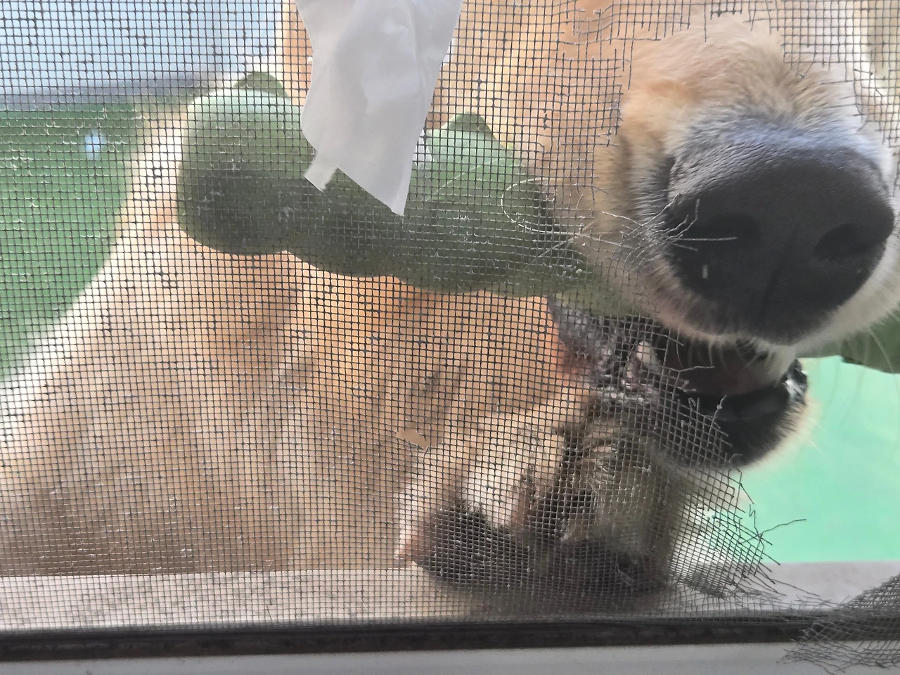 삼월이가 방충망을 가지고 놀다 찢어버렸고