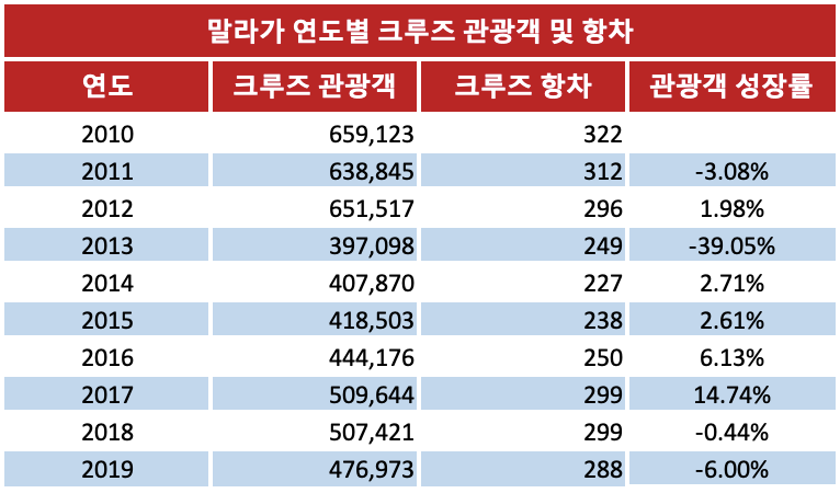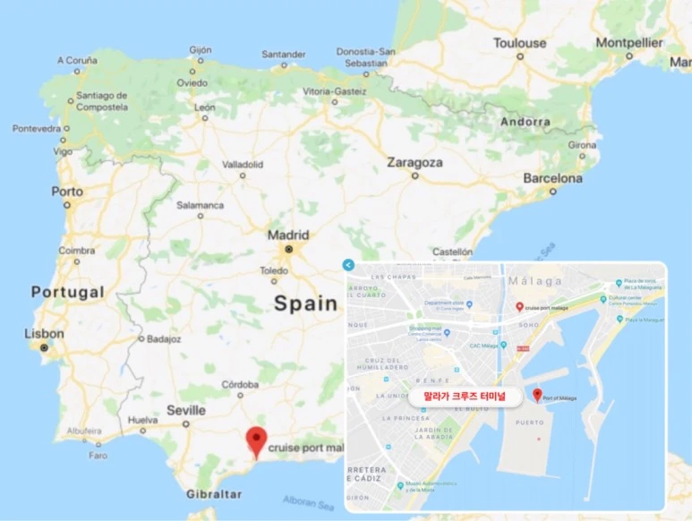 말라가 해변과 연결된 크루즈 터미널은 시내 중심부 및 말라가 대성당까지 도보로 20분 내외가 소요되는 곳에 위치해 있으며, 터미널에서는 시내까지 이동하는 유료 셔틀버스가 10분 간격으로 운영되고 있습니다.. 2010년 이후 연평균 50만 명 내외의 크루즈 관광객이 유입되는 말라가 크루즈 터미널은 관광객 대비 스페인에서 다섯 번째로 규모가 큰 크루즈 기항지입니다.