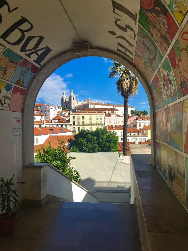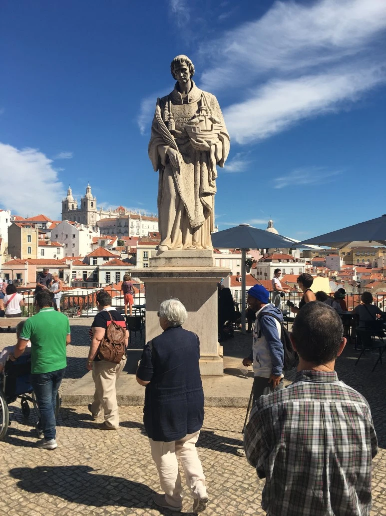 28번 트램이 알파마 지구의 혈관 같은 골목골목을 오르면서 도착하게 되는 첫 번째 대표 관광지는 포르타스 두 솔 전망대(Miradouro das Portas do Sol)입니다. 멀리 태주 강과 빨간색 지붕의 집들이 한눈에 들어오는 두솔 전망대에는 리스본의 수호성으로 알려진 상 비센테의 동상이 있기도 합니다.