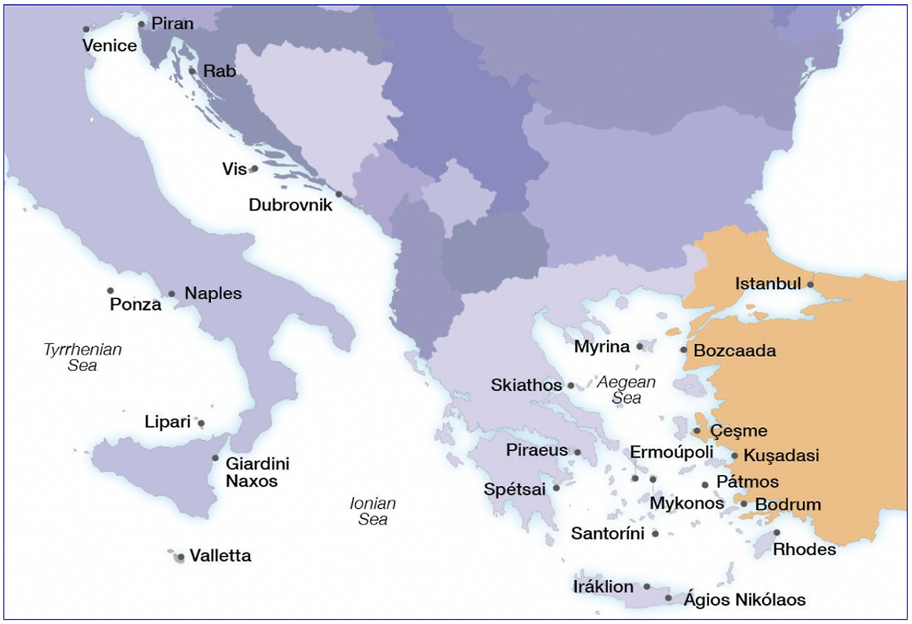 아드리아해를 지나 지중해로 들어선 크루즈 여정은 그리스의 역사와 전설이 살아 숨 쉬는 아테네를 지나 그리스 이오니아 제도에 속한 코르푸섬(원이름:케르키라), 그리스에서 가장 큰 섬으로 관광업이 발전한 크레타섬, 에게해의 대표 관광지 그리스 미코노스섬, 중세도시의 많은 유적들이 유네스코 세계문화유산으로 등재된 그리스 로도스섬, 고대 올림피아 경기의 기원지 그리스 올림피아섬, 가파른 해안절벽에 그리스 국가의 상징색인 청색과 흰색의 집들이 옹기종기 들어선 에게해의 보석 그리스 산토리니, 에게해 연안에 위치한 터키의 대표 리조트 타운으로 에페소스의 관문인 쿠사다시 및 15세기 중세에 건설된 성 베드로 성벽(Castle of Saint Peter)이 있는 아름다운 리조트 타운 터키 보드룸을 거처 동서양의 수도 도시 터키 이스탄불로 이어진다.