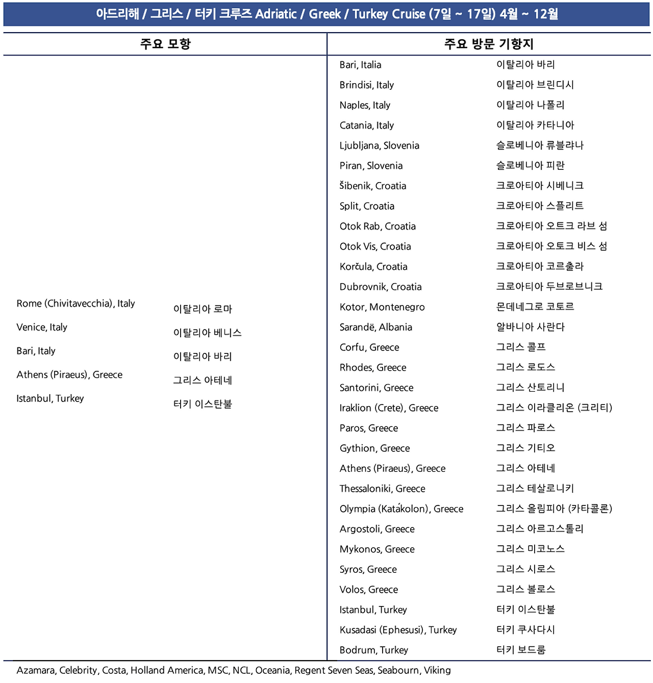 크루즈 라인: Azamara, Celebrity, Costa, Holland America, MSC, NCL, Oceania, Regent Seven Seas, Seabourn, Viking. (2022년과 2023년 선사별 노선 기준)