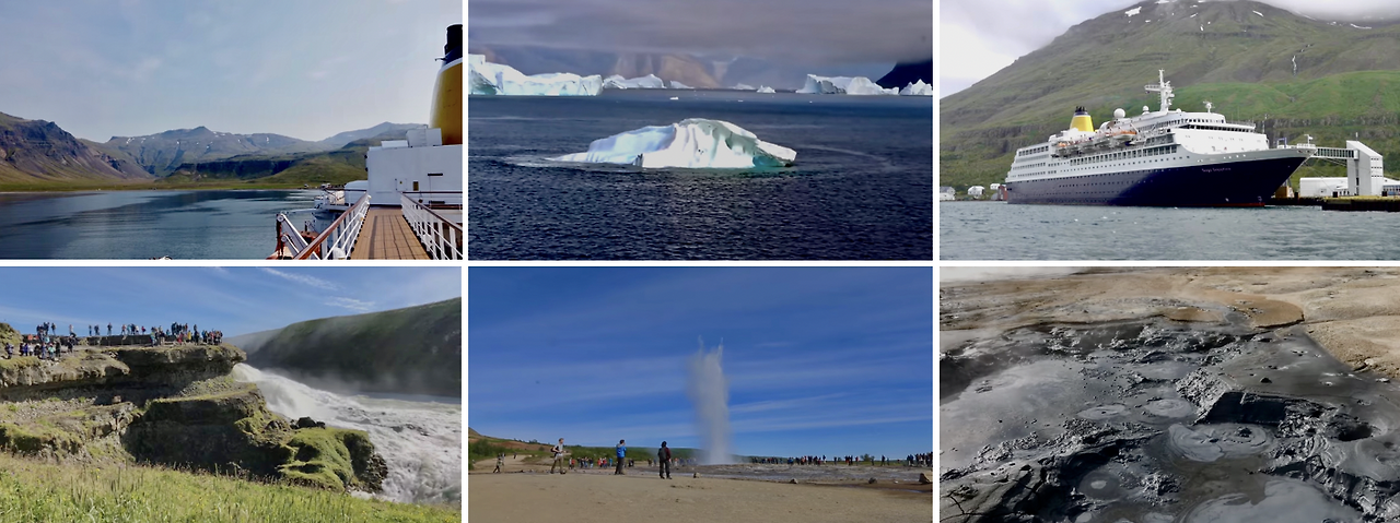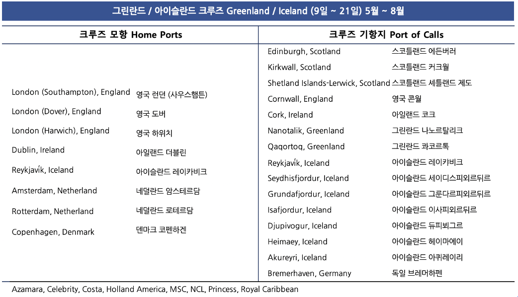아이슬란드와 그린란드의 대표 기항지는 빙하와 활화산이 공존하는 아이슬란드의 수도 레이캬비크, 과거 어업의 마을에서 관광 마을로 탈바꿈한 동부 아이슬란드의 문화 수도 아이슬란드 세이디스피외르뒤르, 영화 제작자의 랜즈를 통해 세계적인 랜드마크로 떠오른 키르큐펠 산(Mt. Kirkjufell)이 위치한 아이슬란드 그룬다르피외르뒤르, 가파르고 들쭉날쭉한 절벽과 울창한 초목으로 이어지는 하이킹 관광의 천국 아이슬란드 헤이파에, 얼음 위에서 북극곰과 물개가 발견되고 밍크고래, 혹등고래 및 지느러미 고래가 빙하 사이로 출현하는 그린란드 나노르탈리크 및 빙하 트래킹의 성지 그린란드 콰코르톡이다.
