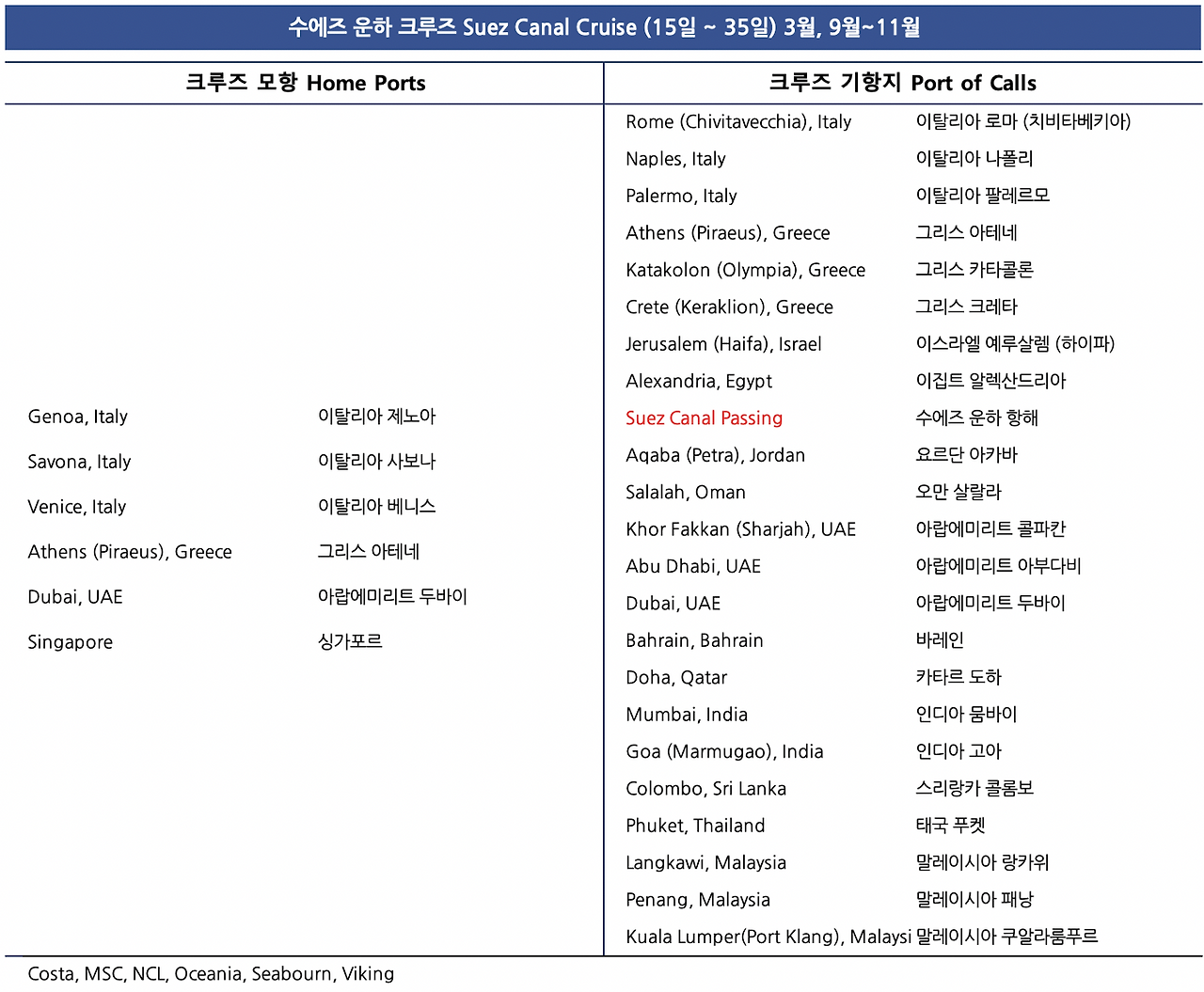 수에즈 운하 크루즈의 대표 모항은 이탈리아의 제노아, 사보나, 베니스와 그리스 아테네 및 아랍에미리트 두바이에서 리포지셔닝 노선으로 운항되고 있다.