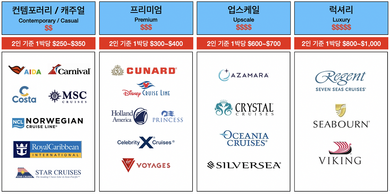 크루즈 라인의 등급별 기본 사양 및 특징은 다음과 같다.
