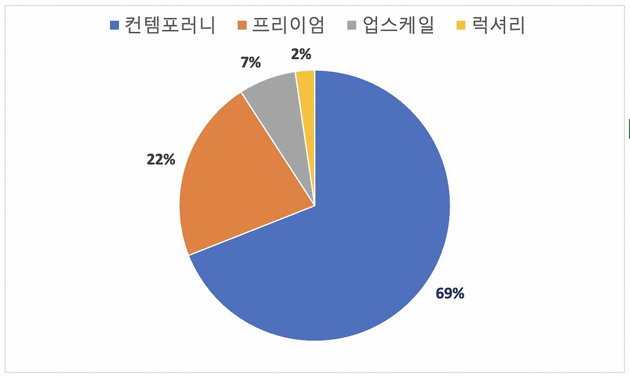 (Cruise Story) 세계크루즈선사협회의 자료에 의하면 크루즈 라인 등급별 승객 점유율은 컨템퍼러리 크루즈 라인 68.6%, 프리미엄 크루즈 라인 21.7%, 업스케일 크루즈 라인 6.8% 및 럭셔리 크루즈 라인 2.3%로 분석되었다.