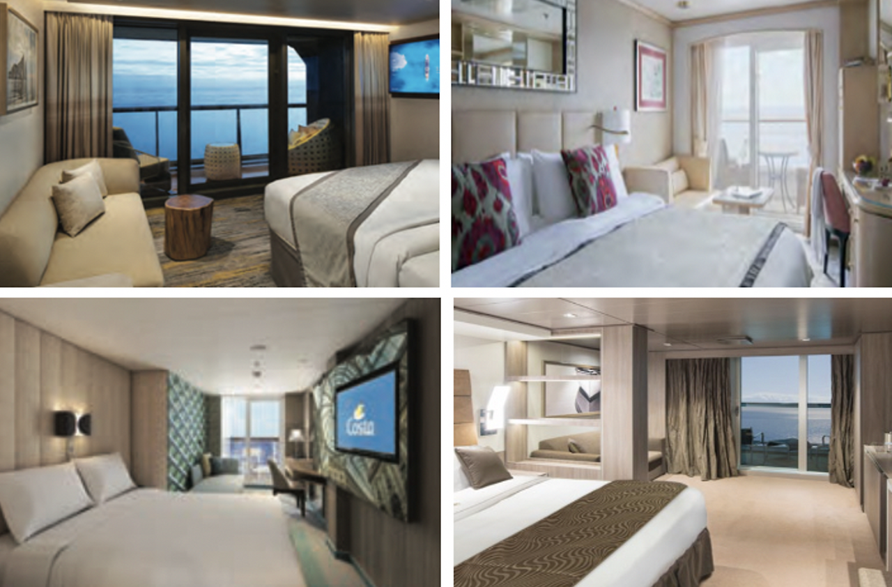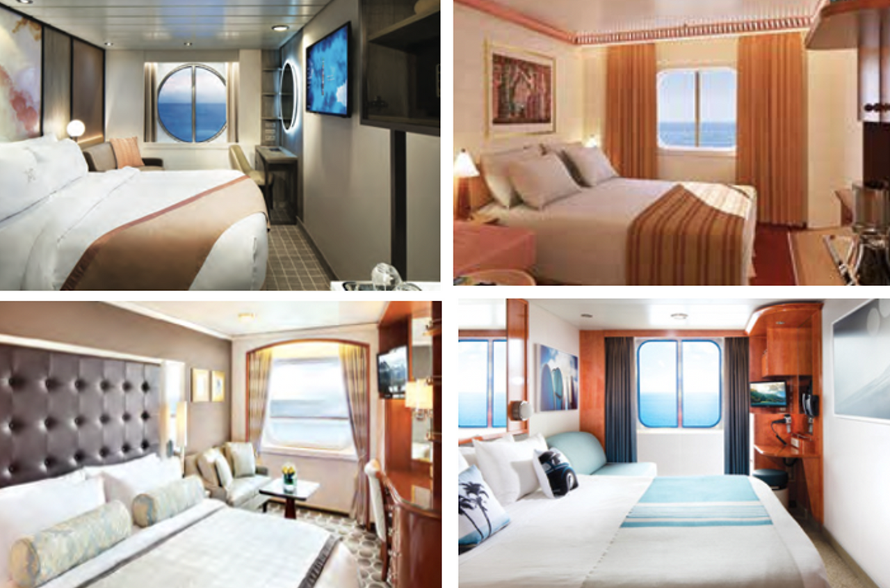 대중적인 컨템포러리 라인과 프리미엄 라인의 객실은 내측, 오션뷰, 발코니 및 스위트 등급으로 구분되며, 각 등급은 위치 및 크기에 따라 다시 여러 유형(Category)으로 세분화된다. 등급별 유형은 객실의 조망권(낮은 데크와 높은 데크, 참고로 층을 Deck로 부름), 위치(선수, 중앙, 선미), 크기 및 승객들에게 제공되는 어메니티 등의 기준으로 구분된다. 쉽게 설명해서 같은 등급의 발코니 객실이라도 높은 층과 낮은 층 또는 선수와 중앙 등 객실 위치에 따라 가격이 다르게 책정된다. 객실 사양은 호텔과 유사하지만, 크기는 일반적으로 호텔보다 작은 편이다. 특히 화장실이 매우 작다. 한편 대부분의 업스케일 및 럭셔리 라인은 발코니와 스위트 객실 등급으로만 운영하고 있다.