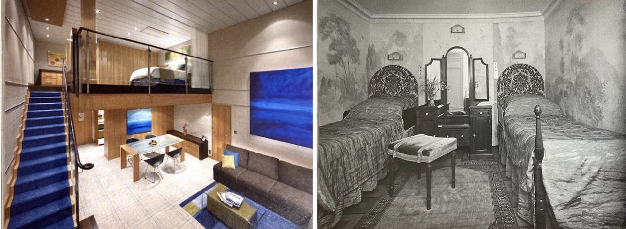 복층 구조로 설계된 스위트 객실과 1914년에 건조된 브리타닉호(The Britanic) 1등석 객실의 침실 내부 모습 (출처 The Great Luxury Liners 1927-1954 by William H. Miller, Jr.)