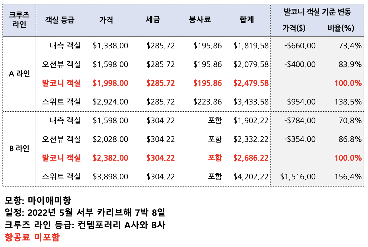 (Cruise Story) 객실 등급에 따른 크루즈 여행 가격 비교표 (2인 기준)