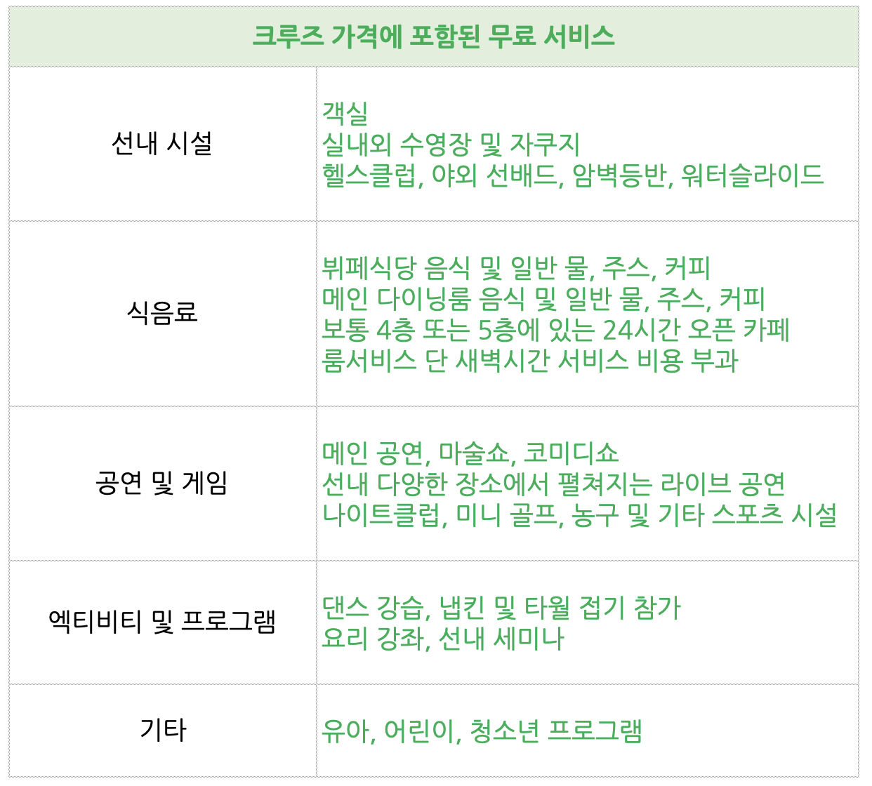 크루즈 가격에 포함된 무료 서비스와 포함되지 않은 유료 서비스에 대한 자세한 사양을 하나씩 알아보자.