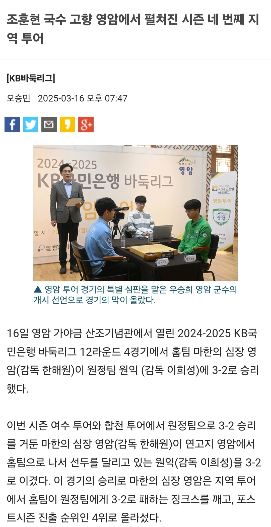 어느 정도 기사에 올라갈 사진을 다 찍은 후 나는 틈틈이 사진과 매칭시켜 기사를 써 내려갔고, 마지막 경기 종료와 거의 동시에 기사를 완성했다. 경기 결과는 홈팀 마한의 심장 영암이 원정팀 원익에 5국까지 가는 접전 끝에 3-2 승리!
