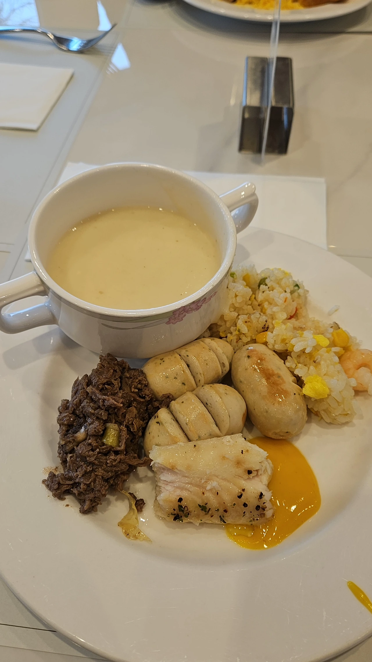 나는 호텔 레스토랑 '토파즈'에 갔고 첫 접시은 프랜치 토스트와 햄, 계란 프라이를 먹었다.