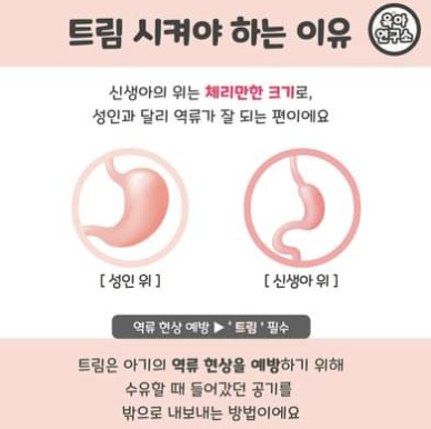 - 아기의 위는 작고 미성숙하기에 항상 트림을 시켜줘야 하며,