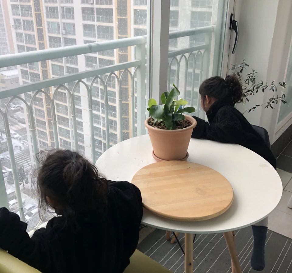 눈이 오는 바깥을 바라보며 하나님이 눈을 주머니에서 많이 꺼내서 뿌리고 있나 보다고 말하고,