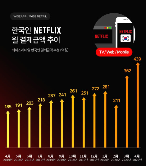 와이즈 앱 (2020. 5). 4월 넷플릭스 카드 결제금액 439억, 역대 최대.