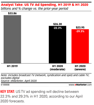 코로나바이러스 감염증으로 국내외 TV 방송 광고 매출은 감소세를 나타내고 있다. 지난 4월, 이마케터(eMarketer)는 미국 1분기 TV 방송 광고 수익에서 전년 대비 22.3%($26.3b) ~ 29.3%($23.95b)로 감소할 것으로 예측했고, 최소 3분기까지 지속적인 하락세를 보일 것으로 전망했다. 특히 코로나 상황 때문에 각종 스포츠 중계가 위축되면서 방송 광고에도 큰 영향을 미친 것으로 보인다.