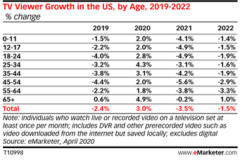 코로나바이러스가 본격화되면서 국내외 TV 시청 시간이 증가했다. 글로벌 시장 조사기관 이마케터(eMarketer)에 의하면, 미국 시청률 증가는 2011년 이후에 처음인데 모든 연령층에서 TV 시청자가 늘어났고 그중에서도 시니어 세대의 증가율이 가장 높게 나타났다. 이런 추세를 바탕으로 일일 평균 시청 시간은 19분에서 2시간 46분으로 증가할 것으로 전망된다. 비슷한 맥락에서 국내 TV 시청 시간도 늘어났는데 닐슨코리아의 TV 시청률 조사에서 코로나 현상이 시작된 2월은 지난해 같은 기간보다 8%가 늘어났고, 1월과 비교해서 13% 가까이 증가했다.