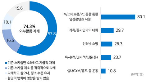 이런 흐름 속에서 미디어 산업은 희비가 엇갈리는 상황이다. 콘텐츠 제작에서는 활동에 제약이 생기면서 소재 선택에 어려움이 있고, 투자금 유치와 회수도 원활하지 않은 편이다. 또한, 광고 매출이 감소하는 추세를 보여 재원 마련에 난항을 겪고 있다. 그러나 코로나 일상으로 사람들이 외부활동을 자제하고 집에 머물러 있는 시간이 늘어나며 국내외 미디어 이용률이 증가하였다. 특히 오디오 북, 영상, 음악 등 실내에서 즐길 수 있는 스트리밍 서비스의 수요가 늘었다. 나스미디어 자료에 의하면, 10명 중 7명은 외부활동을 자제하고 있으며 그 대신 실내에서 영상 콘텐츠를 시청하는 비율이 크게 증가한 것으로 조사되었다. 또한, 오프라인에서 극단적인 대인 간의 단절은 교육, 쇼핑, 재택근무, 회의 등 우리 일상을 비대면과 비접촉 상황이 가능한 온라인을 통해 재구성하며 온택트(ontact) 일상을 연결해가고 있다. 이 안에서 파생된 연관 사업과 신규 사업을 다시 모색하는 기회를 얻기도 한다. 코로나 상황 속에서 과연 미디어 이용은 어떤 변화를 보일까?