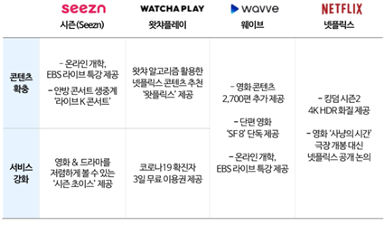 국내에서 OTT 이용이 증가한 것은 서비스에서 코로나 재난 상황을 고려한 다양한 마케팅 전략이 동반되었기 때문이다. 이를 위해 OTT 사업자는 이용자 락인(lock-in)과 신규 이용자 유입을 위해 콘텐츠 확충 및 서비스를 강화하였다. 웨이브와 시즌은 신규 영화 콘텐츠를 추가했고 개학 및 등교 연기에 따른 학교 교육을 보완하기 위해 EBS 라이브 특강을 제공했다. 왓챠플레이는 중앙재난안전대책본부와 협력하여 자가 격리 대상자들에게 ‘3일 무료 이용권’을 지급했다. 넷플릭스는 영화관을 대신해서 최신 개봉작을 선공개했고, 인기 오리지널 콘텐츠를 4K HDR의 고화질로 제공하기도 했다.