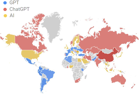 콜롬비아, 에콰도르, 페루, 스페인, 멕시코 등에서 GPT 검색 비중이 ChatGPT와 AI보다 더 많았는데, 콜롬비아, 에콰도르, 스페인은 GPT 검색이 다른 키워드보다 50% 이상으로 나타났다. 또한 중국, 대만, 홍콩, 싱가포르, 포르투갈 등에서는 GPT와 AI보다 ChatGPT 검색 비중이 더 컸다. ChatGPT 검색에서 중국, 대만, 홍콩, 싱가포르 등 4개국은 50% 이상의 비중을 보였고 중국의 경우 70% 이상으로 상당히 높았다. 베트남, 이탈리아, 루마니아, 일본, 태국 등 5개국에서는 AI 검색이 50% 이상으로 GPT나 ChatGPT보다 비중이 더 컸다.