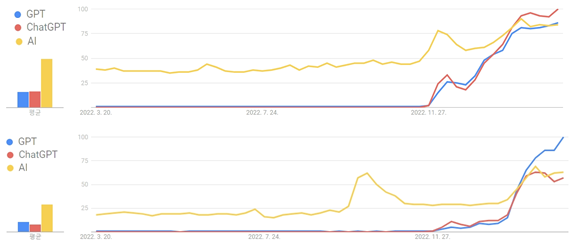 ChatGPT 공개 시점을 기준으로 GPT와 ChatGPT에 대한 검색이 시작되었고 현재까지 우상향 추세로 동반 상승을 보인다. 이는 단시간에 형성된 대중의 관심이 상당히 높은 수준임을 확인할 수 있다. 마찬가지로 AI도 ChatGPT 공개일을 기준으로 상승을 보였고 이후 GPT와 ChatGPT의 추세와 함께 이전보다 상승하며 대중적 관심이 상향한 것으로 나타났다. 현재 글로벌 검색 추세를 보면, ChatGPT가 GPT와 AI보다 조금 더 검색량이 많은 것으로 보인다. ChatGPT는 대용량 언어에 특화된 모델로써 AI와 GPT의 하위 영역에 해당하지만, 검색량에서는 조금 더 앞서 있었다. 즉 세계적 관심에서 ChatGPT는 GPT와 AI보다 높은 편이라고 할 수 있다. 반면, 국내 검색 추이는 글로벌 추세와 다른 점을 발견할 수 있다. 전반적으로 키워드 검색 추세가 글로벌 추세와 유사한 흐름을 보였지만, 현재 국내 검색 추세에서 GPT의 검색량이 ChatGPT와 AI보다 상승한 것을 알 수 있다. 즉 국내에서는 세부 영역인 ChatGPT보다 그 상위 영역인 GPT에 대한 관심이 더 많았다.