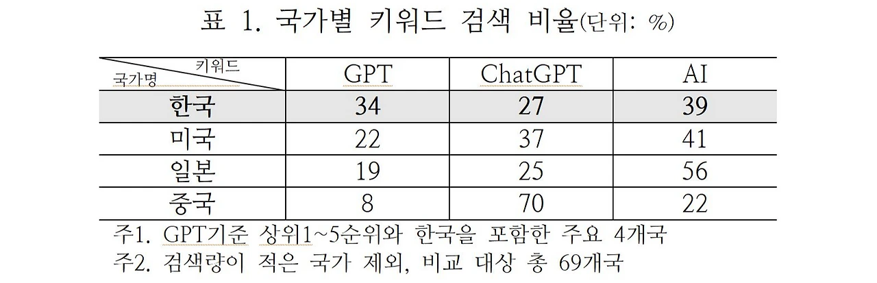 중국은 ChatGPT에 대한 관심이 압도적으로 많았고, 일본은 AI에 대한 관심이 전체 구성에서 과반의 비중으로 GPT나 ChatGPT보다 높았다. 국내의 경우, 1년의 추세 분석에서 최근에 GPT 관심이 상승했으나, 상승 구간만 종합해 보면 3가지 키워드가 GPT 34%, ChatGPT 27%, AI 39%로 AI가 가장 많았고 GPT, ChatGPT의 순서로 비슷한 수준에서 차이를 보였다. 마찬가지로 미국은 GPT 22%, ChatGPT 37%, AI 41%로 AI가 가장 많았고 ChatGPT, GPT의 순서로 차이를 보였다. 괄목할 점은 중국에서 ChatGPT의 관심이 상당히 높았는데, OpenAI를 비롯한 미국 태생의 테크 기업들이 ChatGPT를 주도하고 있지만 대중의 관심은 상대적으로 낮았던 것에 비해 중국은 ChatGPT에 대한 대중적 관심이 국가 전반에서 크게 일어난 것으로 보인다.
