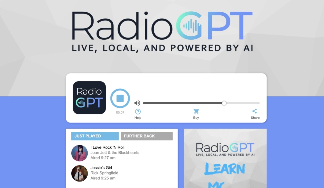 미국 미디어 기업 퓨튜리(Futuri)는 세계 최초로 지역 라디오 GPT 플랫폼 ‘RadioGPT’를 선보였다. RadioGPT는 인터넷 상의 수많은 정보를 자동으로 수집해서 이를 바탕으로 라디오 방송 대본을 자동으로 생성한 후, AI DJ보이스로 방송을 진행하는 형태이다. 이전에 방송 분야에 도입된 AI는 유명인의 목소리를 딥러닝해서 제작진이 작성한 원고를 AI 보이스로 전달하는 방식이었다. 이와 달리 RadioGPT는 라디오 방송을 위한 사전 자료 조사부터 대본 구성과 작성, 방송 진행까지 AI 스스로 진행한다는 점에서 제작 과정 전반에서 활용된다.