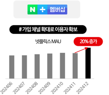 넷플릭스가 네이버 플러스 멤버십과 제휴한 시기를 보면, <오징어 게임 2>가 공개되기 2달 전부터 홍보를 시작했고, 공개 1달 전부터는 본격적으로 제휴 서비스를 실행한 것을 확인할 수 있다. 네이버 플러스 멤버십에서 넷플릭스를 이용하기 시작하면서 넷플릭스의 월간 활성화 이용자수(MAU)는 2024년 11월과 12월을 비교하면 한 달 사이에 20%가 증가하는 긍정적인 효과로 이어질 수 있었다.