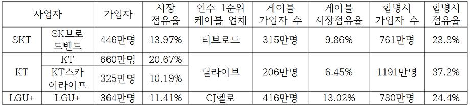 현재 이 시나리오가 실행된다면, KT가 딜라이브를 인수하면서 가입자 수 1191만 명, 합산 점유율 37.2%로 여전히 업계 1위를 유지하게 된다. 그러나 SKT는 가입자수 761만 명, 합산 점유율 23.8%로 업계 3위로 밀려나는 반면, 그 대신에 LG U+가 가입자수 780만 명을 확보하며 합산 점유율 24.4%로 업계 2위를 차지하게 된다.