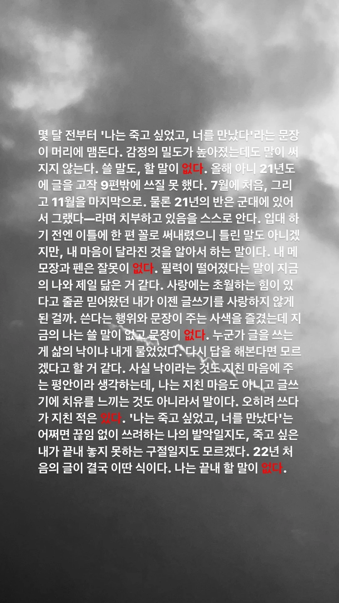 몇 달 전부터 '나는 죽고 싶었고, 너를 만났다'라는 문장이 머리에 맴돈다. 감정의 밀도가 높아졌는데도 말이 써지지 않는다. 쓸 말도, 할 말이 없다. 올해 아니 21년도에 글을 고작 9편밖에 쓰질 못 했다. 7월에 처음, 그리고 11월을 마지막으로. 물론 21년의 반은 군대에 있어서 그랬다—라며 치부하고 있음을 스스로 안다. 입대 하기 전엔 이틀에 한 편 꼴로 써내렸으니 틀린 말도 아니겠지만, 내 마음이 달라진 것을 알아서 하는 말이다. 내 메모장과 펜은 잘못이 없다. 필력이 떨어졌다는 말이 지금의 나와 제일 닮은 거 같다. 사랑에는 초월하는 힘이 있다고 줄곧 믿어왔던 내가 이젠 글쓰기를 사랑하지 않게 된 걸까. 쓴다는 행위와 문장이 주는 사색을 즐겼는데 지금의 나는 쓸 말이 없고 문장이 없다. 누군가 글을 쓰는 게 삶의 낙이냐 내게 물었었다. 당시에 어떻게 대답을 했는지 기억 나지 않지만, 다시 답을 해본다면 모르겠다고 할 거 같다. 사실 낙이라는 것도 지친 마음에 주는 평안이라 생각하는데, 나는 지친 마음도 아니고 글쓰기에 치유를 느끼는 것도 아니라서 말이다. 오히려 쓰다가 지친 적은 있다. '나는 죽고 싶었고, 너를 만났다'는 어쩌면 끊임 없이 쓰려하는 나의 발악일지도 모르겠다. '너'라는 것도 이 문장 자체이고, 죽고 싶은 내가 끝내 놓지 못하는 구절일지도 모르겠다. 22년 처음의 글이 결국 이딴 식이다. 나는 끝내 할 말이 없다.