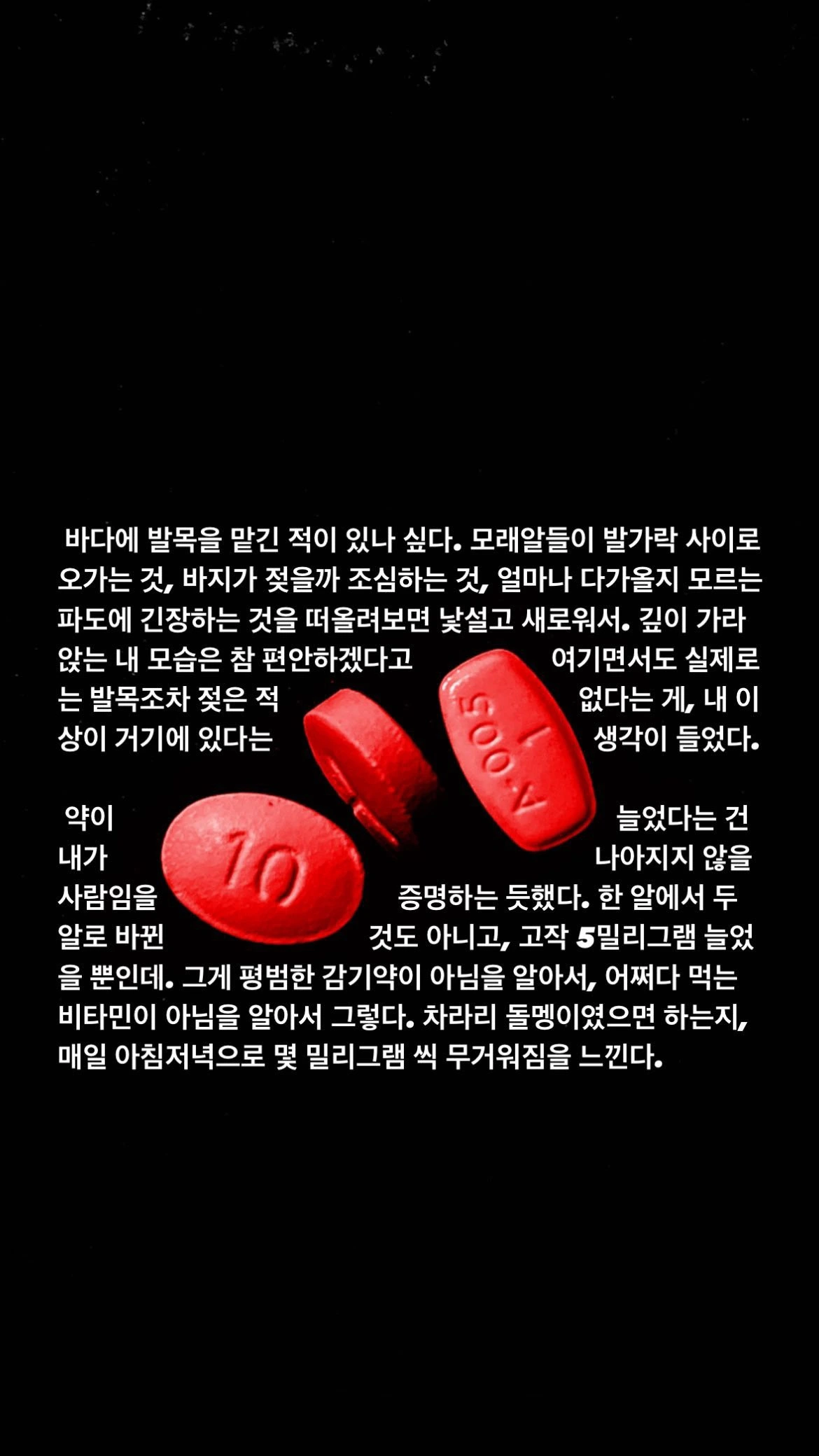 약이 늘었다는 건 내가 나아지지 않을 사람임을 증명하는 듯했다. 한 알에서 두 알로 바뀐 것도 아니고, 고작 5밀리그램 늘었을 뿐인데. 그게 평범한 감기약이 아님을 알아서, 어쩌다 먹는 비타민이 아님을 알아서 그렇다. 차라리 돌멩이였으면 하는지, 매일 아침저녁으로 몇 밀리그램 씩 무거워짐을 느낀다.