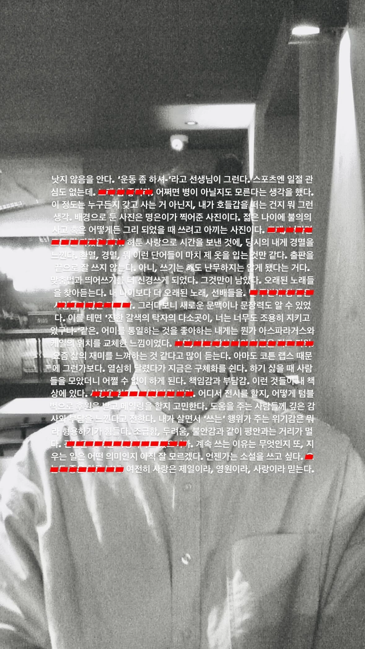 낫지 않음을 안다. '운동 좀 하셔-'라고 선생님이 그런다. 스포츠엔 일절 관심도 없는데. 노래 참 좋더라. 어쩌면 병이 아닐지도 모른다는 생각을 했다. 이 정도는 누구든지 갖고 사는 거 아닌지, 내가 호들갑을 떠는 건지 뭐 그런 생각. 배경으로 둔 사진은 명은이가 찍어준 사진이다. 젊은 나이에 불의의 사고 혹은 어떻게든 그리 되었을 때 쓰려고 아끼는 사진이다. 그래, 너라면 모든 걸 가졌을 거야. 허툰 사랑으로 시간을 보낸 것에, 당시의 내게 경멸을 느낀다. 환멸, 경멸 뭐 이런 단어들이 마치 제 옷을 입는 것만 같다. 출판을 끝으로 잘 쓰지 않는다. 아니, 쓰기는 해도 난무하지는 않게 됐다는 거다. 맞춤법과 띄어쓰기를 더 신경쓰게 되었다. 그것만이 남았다. 오래된 노래들을 찾아듣는다. 내 나이보다 더 오래된 노래, 선배들을. 넌 주변에 참 좋은 사람들이 많은 거 같아. 그러다보니 새로운 문맥이나 문장력도 알 수 있었다. 이를 테면 '진한 갈색의 탁자에 다소곳이, 너는 너무도 조용히 지키고 있구나'같은. 어미를 통일하는 것을 좋하는 내게는 뭔가 아스파라거스와 케일의 위치를 교체한 느낌이다. 수연, 나는 항상 너의 이름을 적고 지워. 요즘 삶의 재미를 느껴하는 것 같다고 많이 듣는다. 아마도 코튼 랩스때문에 그런가보다. 열심히 달렸다가 지금은 구체화를 쉰다. 하기 싫을 때 사람들을 모았더니 어쩔 수 없이 하게 된다. 책임감과 부담감. 이런 것들이 내 책상에 있다. 사랑을 한다면 사랑하길 바라. 어디서 전시를 할지, 어떻게 텀블벅으로 후원을 받고 메일링을 할지 고민한다. 도움을 주는 사람들께 깊은 감사와 부담을 느낀다고 전한다. 내가 살면서 '쓰는' 행위가 주는 위기감은 뭐라 형용하기가 힘들다. 조급함, 두려움, 불안감과 같이 평안과는 거리가 멀다. 관찰을 하려면 사랑하라고 했으니까. 계속 쓰는 이유는 무엇인지 또, 지우는 일은 어떤 의미인지 아직 잘 모르겠다. 언젠가는 소설을 쓰고 싶다. 오늘도 좋은 하루 보내. 여전히 사랑은 제일이라, 영원이라, 사랑이라 믿는다.