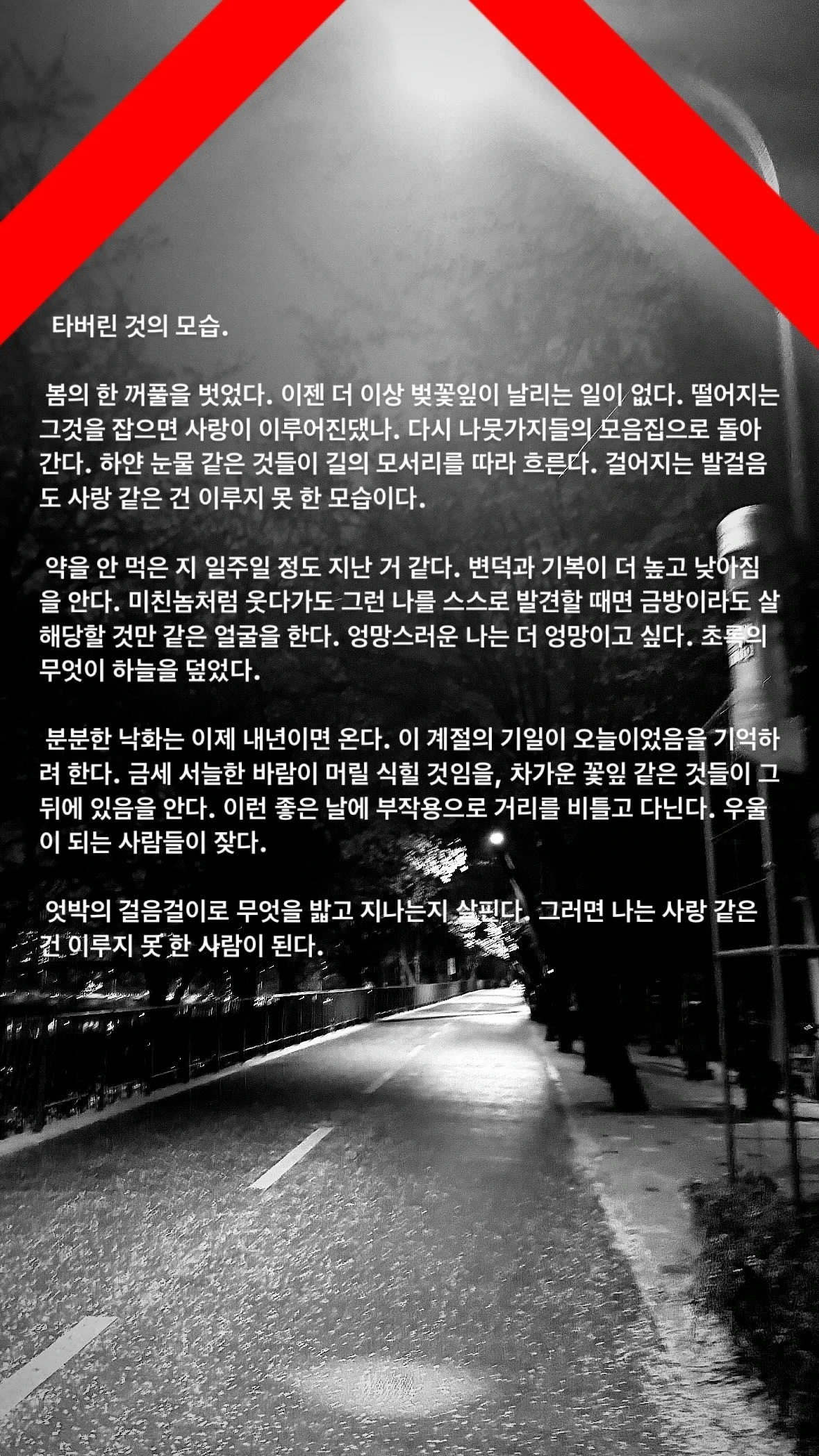 분분한 낙화는 이제 내년이면 온다. 이 계절의 기일이 오늘이었음을 기억하려 한다. 금세 서늘한 바람이 머릴 식힐 것임을, 차가운 꽃잎 같은 것들이 그 뒤에 있음을 안다. 이런 좋은 날에 부작용으로 거리를 비틀고 다닌다. 우울이 되는 사람들이 잦다.