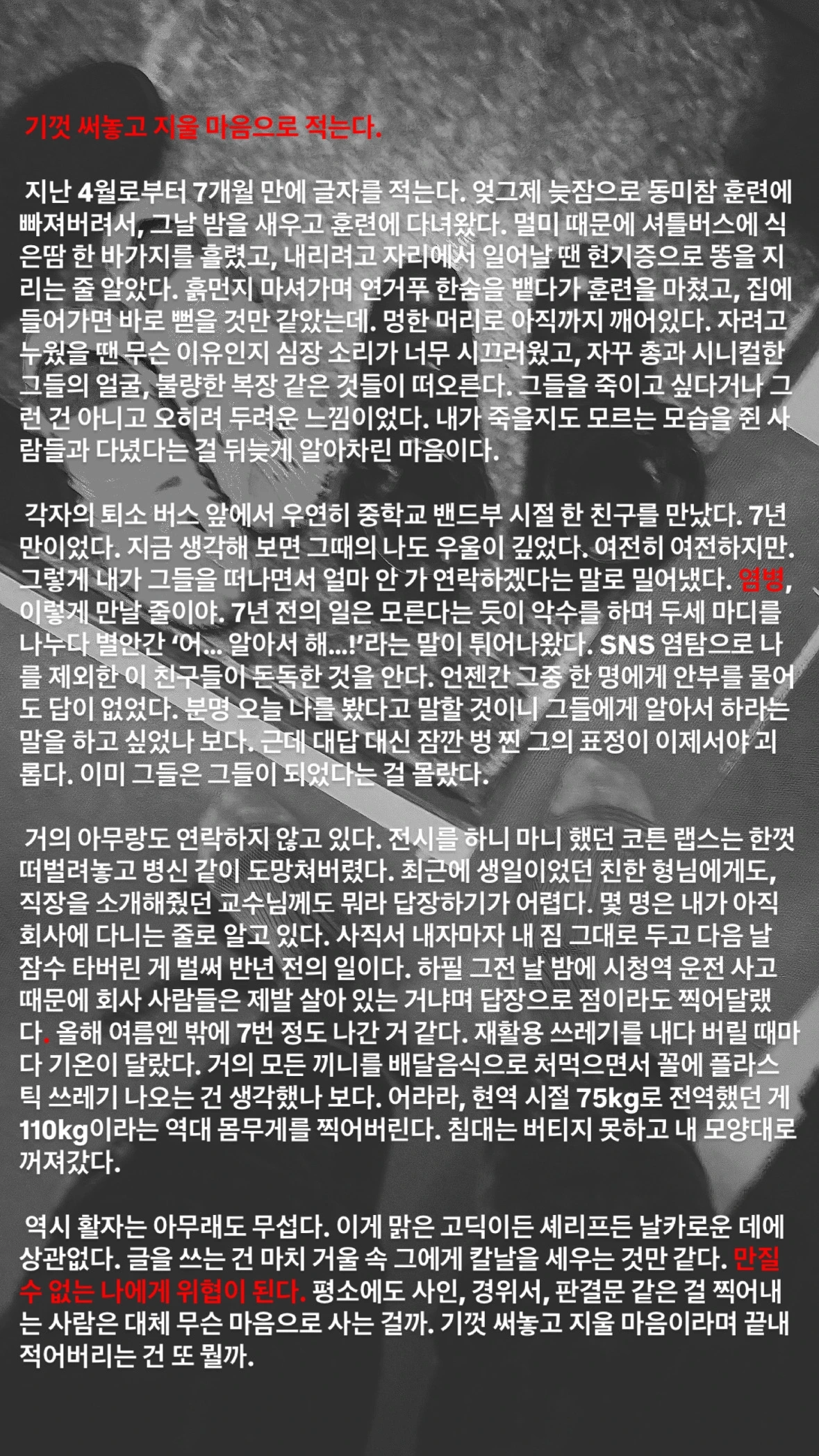 각자의 퇴소 버스 앞에서 우연히 중학교 밴드부 시절 한 친구를 만났다. 7년 만이었다. 지금 생각해 보면 그때의 나도 우울이 깊었다. 여전히 여전하지만. 그렇게 내가 그들을 떠나면서 얼마 안 가 연락하겠다는 말로 밀어냈다. 염병, 이렇게 만날 줄이야. 7년 전의 일은 모른다는 듯이 악수를 하며 두세 마디를 나누다 별안간 ‘어… 알아서 해…!’라는 말이 튀어나왔다. SNS 염탐으로 나를 제외한 이 친구들이 돈독한 것을 안다. 언젠간 그중 한 명에게 안부를 물어도 답이 없었다. 분명 오늘 나를 봤다고 말할 것이니 그들에게 알아서 하라는 말을 하고 싶었나 보다. 근데 대답 대신 잠깐 벙 찐 그의 표정이 이제서야 괴롭다. 이미 그들은 그들이 되었다는 걸 몰랐다.