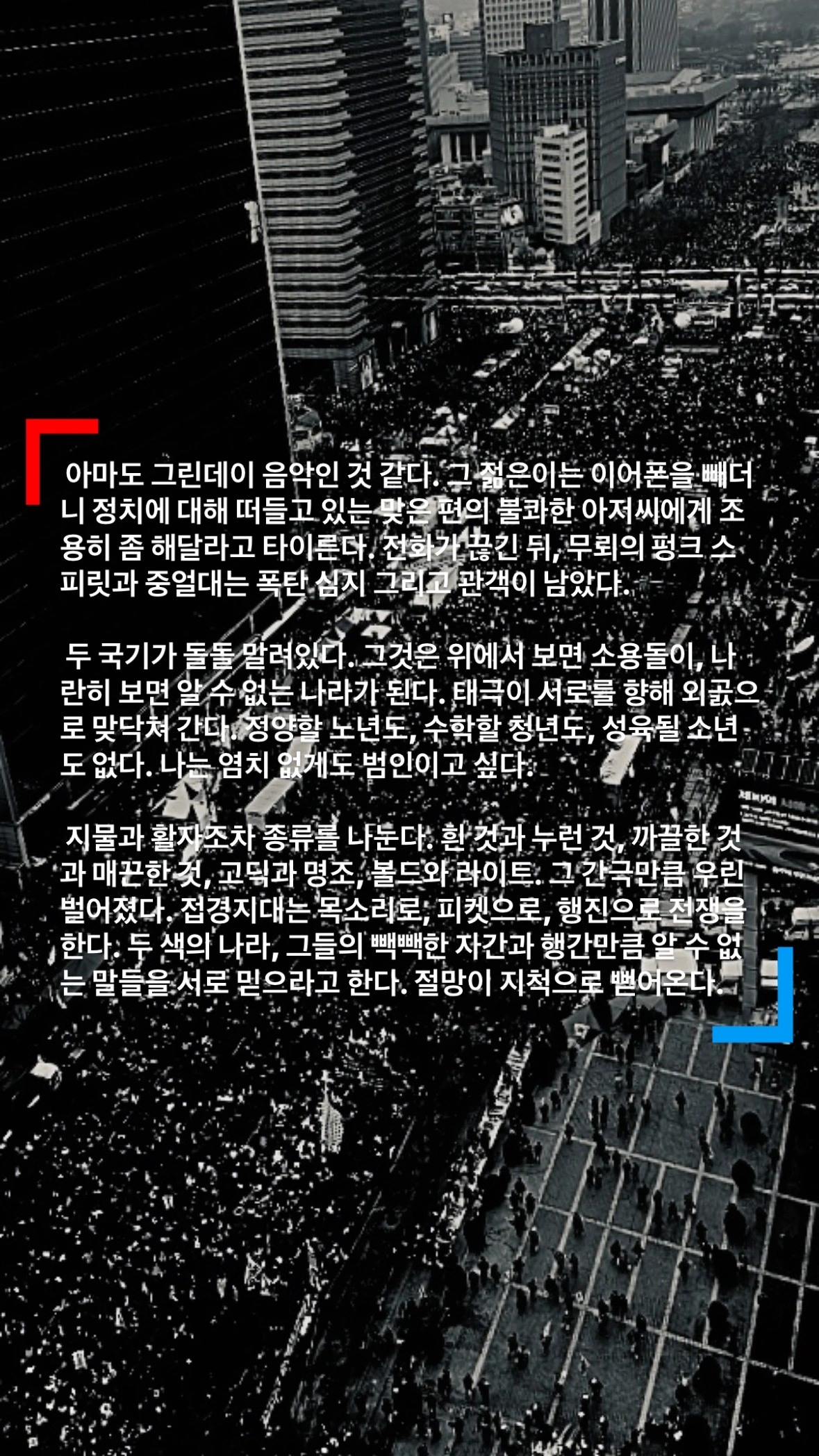 지물과 활자조차 종류를 나눈다. 흰 것과 누런 것, 까끌한 것과 매끈한 것, 고딕과 명조, 볼드와 라이트. 그 간극만큼 우린 벌어졌다. 접경지대는 목소리로, 피켓으로, 행진으로 전쟁을 한다. 두 색의 나라, 그들의 빽빽한 자간과 행간만큼 알 수 없는 말들을 서로 믿으라고 한다. 절망이 지척으로 뻗어온다.