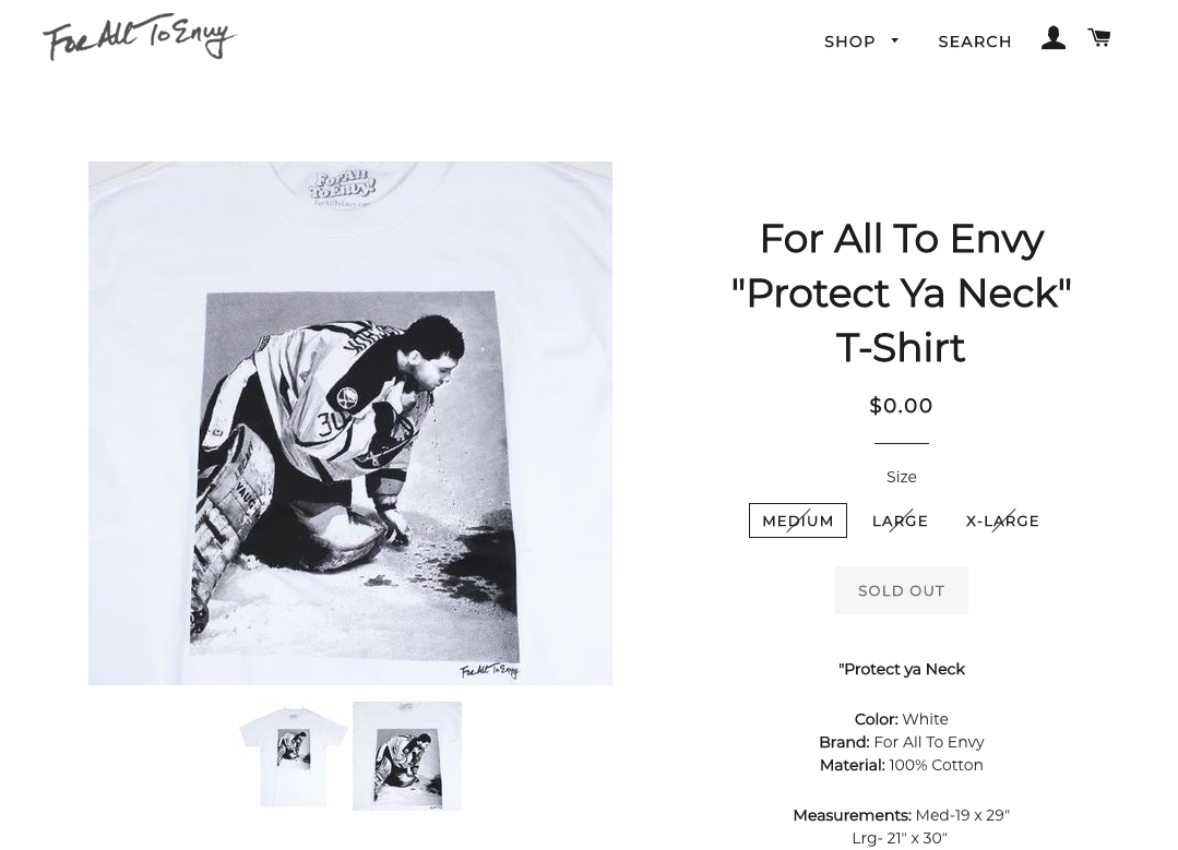 For All To Envy 공식 홈페이지에서 판매하고 있는 위 사진 속 티셔츠를 한번 보자. 흰 무지 티셔츠 위에 크게 프린팅 되어 있는 사진 속의 주인공은 캐나다 출신 전 아이스하키 프로 선수 클린트 말라축Clint Malarchuk이다. 1989년 3월 22일, 당시 뉴욕 버펄로 세이버스에 소속되어 있던 클린트 말라축이 상대팀 선수의 스케이트날에 오른쪽 목 앞을 베이며 아이스하키 경기장의 새하얀 빙판 위에 엄청난 피를 흘리는 큰 사고를 겪게 되는데 현재까지도 스포츠 역사 상 가장 심각한 부상 중 하나로 회자되는 이 사고를 적나라하게 담은 사진을 흑백 처리하여 티셔츠 위에 담고 그들은 'Protect Ya Neck(네 모가지 조심해)'이라는 제목을 달아 판매한다. (앞에서 잠깐 언급하였지만) 다시 부연하자면 ‘Protect Ya Neck’은 미국 올드스쿨 힙합 그룹 WU-TANG CLAN의 언더그라운드 데뷔 히트 싱글의 제목을 그대로 딴 문장이다. 만일 어떤 브랜드에서 이와 똑같은 티셔츠를 'Neck Injury' 또는 'Neck Blood' 정도로 정해 아무런 컨셉과 내재된 스토리 없이 발매했다면 결과가 과연 어땠을까를 상상해본다. 음, 판매는 고사하고 혐오스러운 프린팅 사진에 대한 클레임이 빗발치지 않았을까. 그들은 현재의 힙합 정신의 정신적 고향이자 뿌리가 되는 90년대 초반 올드스쿨 힙합의 대명사인 우탱 클랜의 빛 바랜 아이디어를 지금 여기로 불러와서 일종의 컨셉 차용만으로 새로운 창조 경제를 실현한 것이다. 시장에서 파는 옷을 잔뜩 떼와서 택만 갈아 판매해 이윤을 챙기는 자칭 크리에이티브 패션 기업들의 창조 경제만큼이나 똑똑한 아이디어라고 할 수 있다.