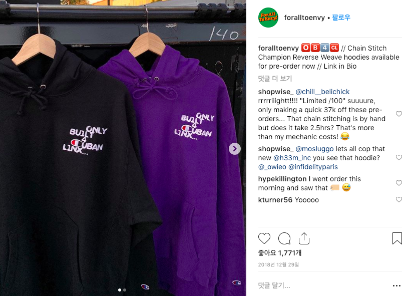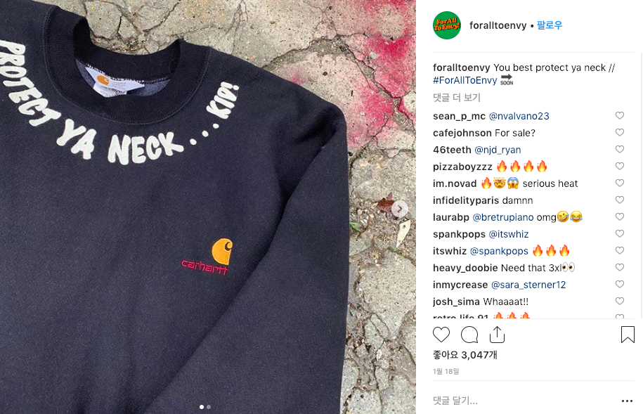 올드스쿨 힙합을 즐겨 들었거나 그것에 조금이라도 관심이 있는 사람이라면 아래 For All To Envy의 공식 인스타그램 계정 게시물에서 볼 수 있는 챔피온 스웻 후디드 티셔츠와 칼하트의 스웻셔츠 위에 새겨진 문구가 꽤 익숙할지도 모르겠다.
