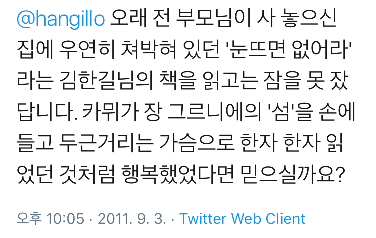 군에서 휴가를 나왔을 때로 기억하는데, 트위터 계정을 만들어 김한길 선생님을 팔로잉하고 무심코 날린 트윗에 ‘밤눈을 감지 못하게 해 미안하다’라며 센스 있는 답변을 달아줬던 선생님의 트윗이 생각난다. 그런데 이거 어쩌죠. 작가님은 아직도 가끔씩 제 밤눈을 감지 못하게 하시거든요.