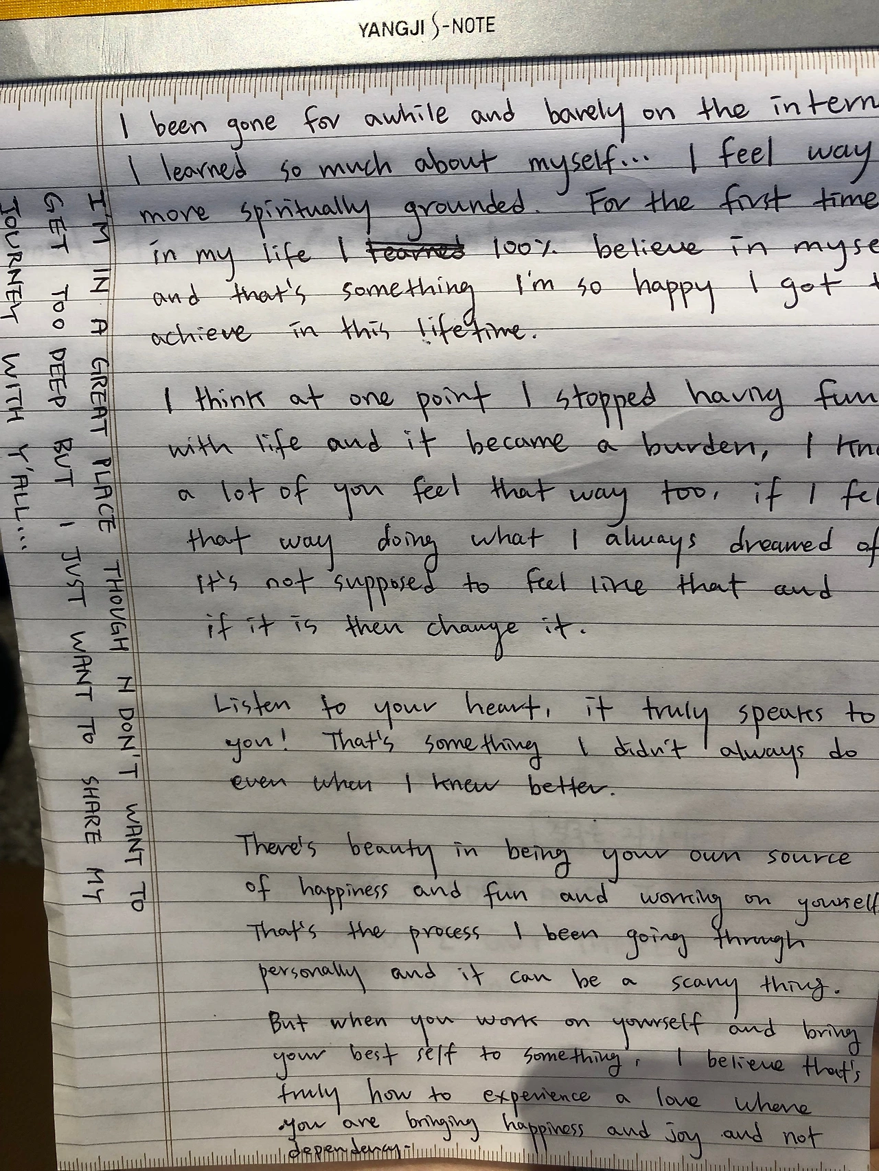 각설하겠습니다. 아무튼 저렇게 올 3월 인스타그램 비디오 포스팅을 통해 과거와 현재의 자신의 정신 상태에 대해 열심히 떠들었던 래퍼 빅션이 이틀 전인 7월 26일, 싱글곡 'Single Again'을 발표했습니다. 그야말로 따끈따끈한 신곡입니다. 빅션은 이 곡을 발표하기 몇 시간 전에 자신의 트위터 계정을 통해 노래와 관련한 자신의 생각을 담담하게 풀어놓았는데, 그것이 또 제 가슴을 뜨겁게 했습니다. 저는 필사가 취미인 사람인지라 굳이 또 그 트윗 내용을 무려 양지 S노트에 옮겨 적었습니다(싸고 좋아요). 참 한가한 사람이죠.