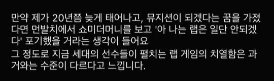 이제 힙합 시장은 꽤 많은 양의 돈이 자유롭게 흐르며 순환하는 비즈니스의 장이 되었습니다. 화려한 랩 스킬, 참신한 주제의식, 트렌드에 부합하며 맛깔난 사운드 등을 개별적으로 치열하게 추구하고 그것들을 균형적으로 조합하여 똑똑하게 선보일 줄 아는 사람은 힙합의 근원지 미국에서나 (애플 식 표현으로) 힙합의 3.5차 출시국 한국에서나 괜찮은 대우를 받죠. 그들은 겨우 '힙합이나 하는 놈'에서 무려 '돈 잘 버는 아티스트'가 된 것입니다. 이러한 배경 속에서 래퍼가 되고자 하는 이들의 절대 숫자도 폭발적으로 증가하고 있습니다. 원인이 있으면 그에 따른 결과가 있는 법이니까요. 관련하여 올해 8월 4일, 래퍼 '버벌진트'가 자신의 인스타그램 계정에 올린 다음과 같은 포스팅은 인상적이었습니다.