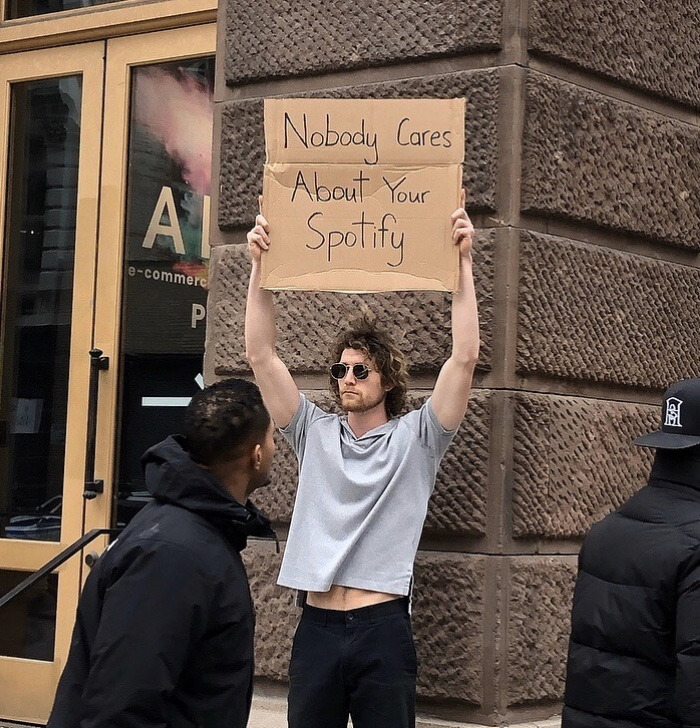 좋아하는 래퍼의 패션, 좋아하는 외국 가수의 내한 공연 실황, 좋아하는 패션 브랜드의 신상품 화보, 인터넷에 떠도는 나 혼자만 웃긴 콘텐츠, 나 혼자만 감동한 소설 속 문장, 나 혼자만 좋아하는 음악 등의 극히 주관적인 관심사를 카카오톡 채팅방에 시도 때도 없이 올리는 사람의 하나로서 인스타그램 계정 'dudewithsign'의 다음과 같은 포스팅은 나를 머쓱하게 하였고 심지어 지난 몇 년간의 소셜 인생을 되돌아보게 하였다.