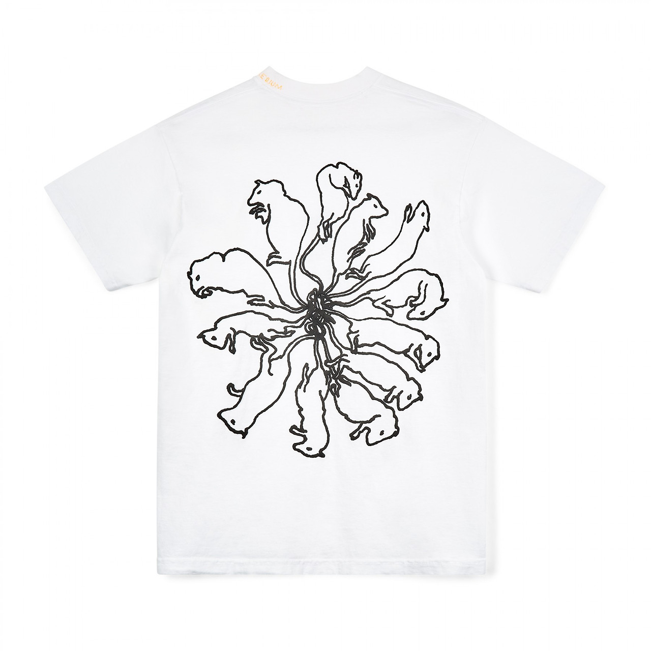 디자이너 제리 로렌조의 패션 브랜드 FEAR OF GOD에 대항하기 위해 2020 경자년 특수로 만든 게릴라 브랜드가 아닐까, 엉뚱한 상상마저 부르는 FEAR OF THE RAT 2020 티셔츠의 후면부에는 서로 꼬리가 묶인 12마리의 쥐를 묘사한 그림이 프린팅 되어 있습니다. 각자의 자유를 찾아가려는 듯이 바깥쪽을 향해 몸을 펼치고 있는 그들의 몸매가 굉장히 징그럽습니다.