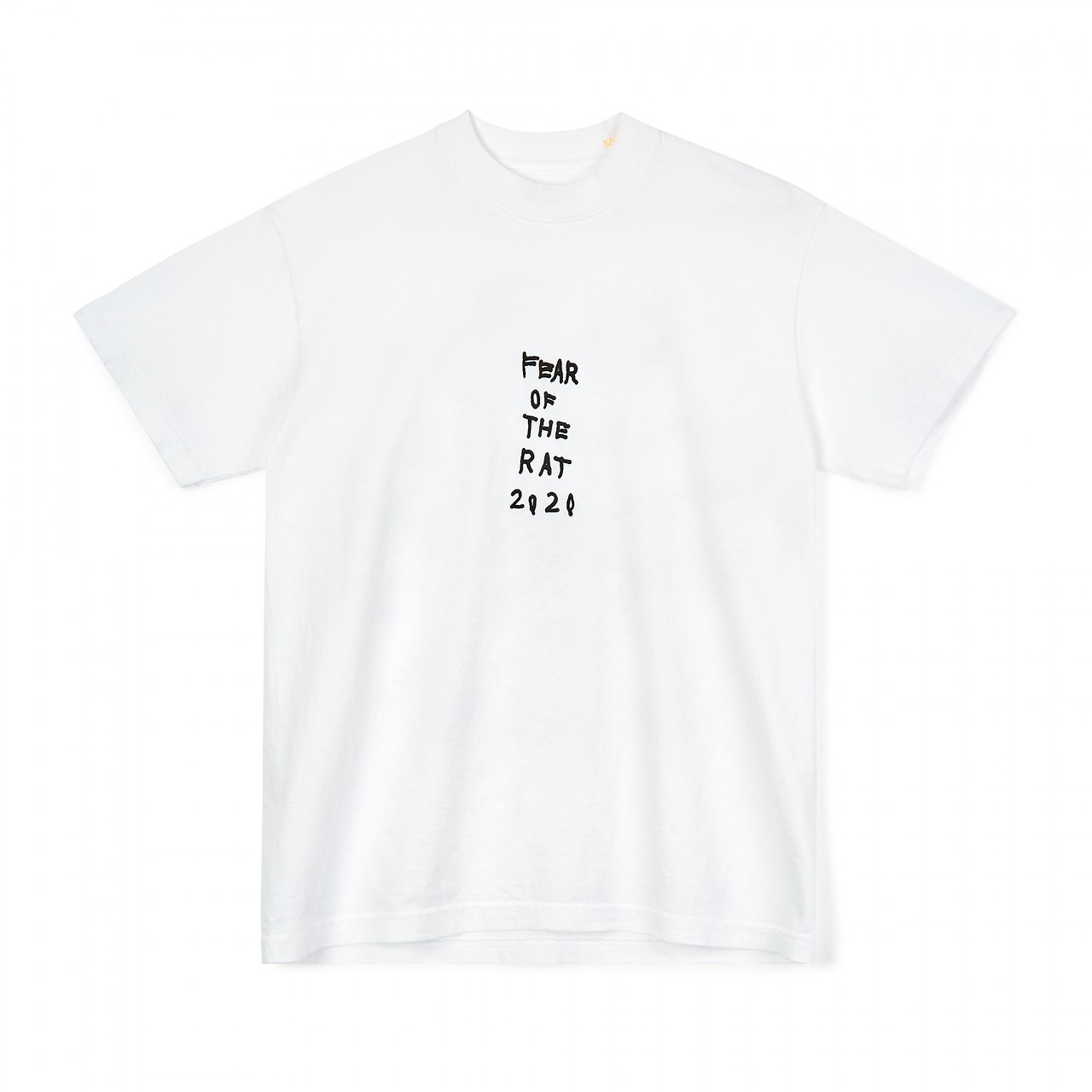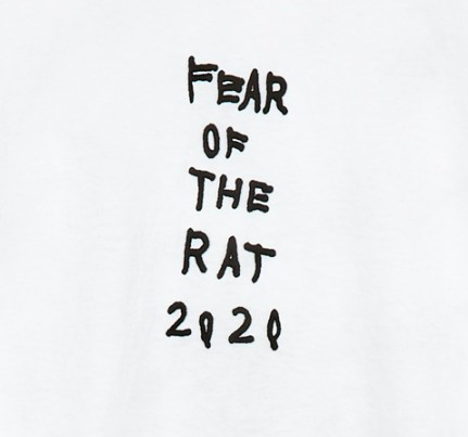 흰 티셔츠의 전면부 가운데에 박힌 ‘FEAR OF THE RAT 2020’이라는 문구, 마치 이제 막 데스크톱 컴퓨터에 눈을 뜬 어린 소년이 윈도우 98의 그림판 위에 볼 마우스를 이용해 되는대로 대충 글자를 끄적인듯한 모양인데요, 엉터리 같은 글씨체가 대단히 인상적입니다.