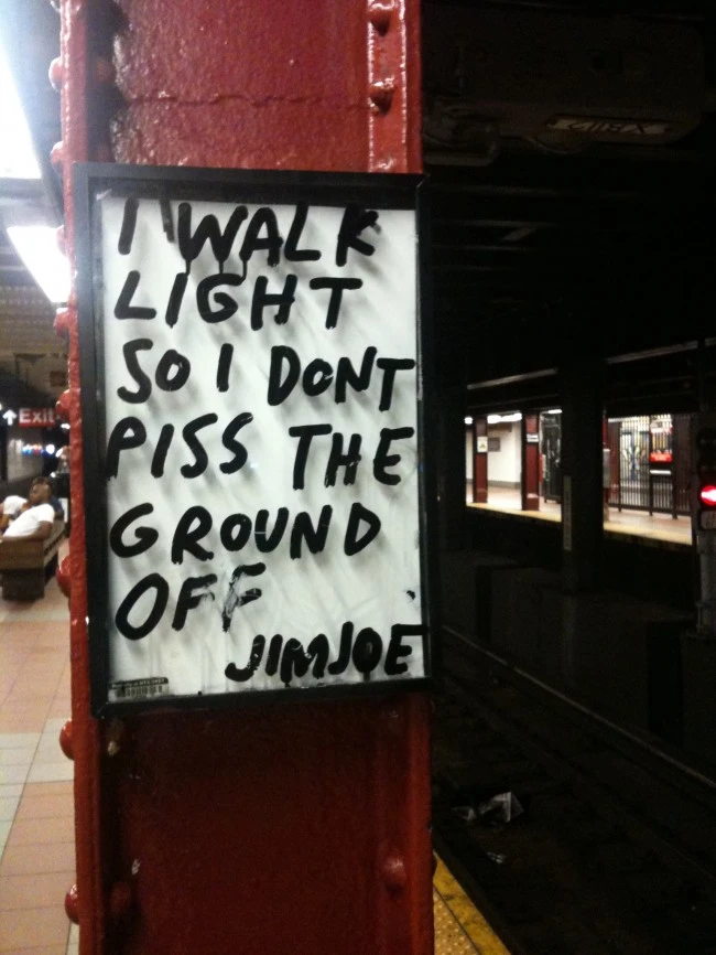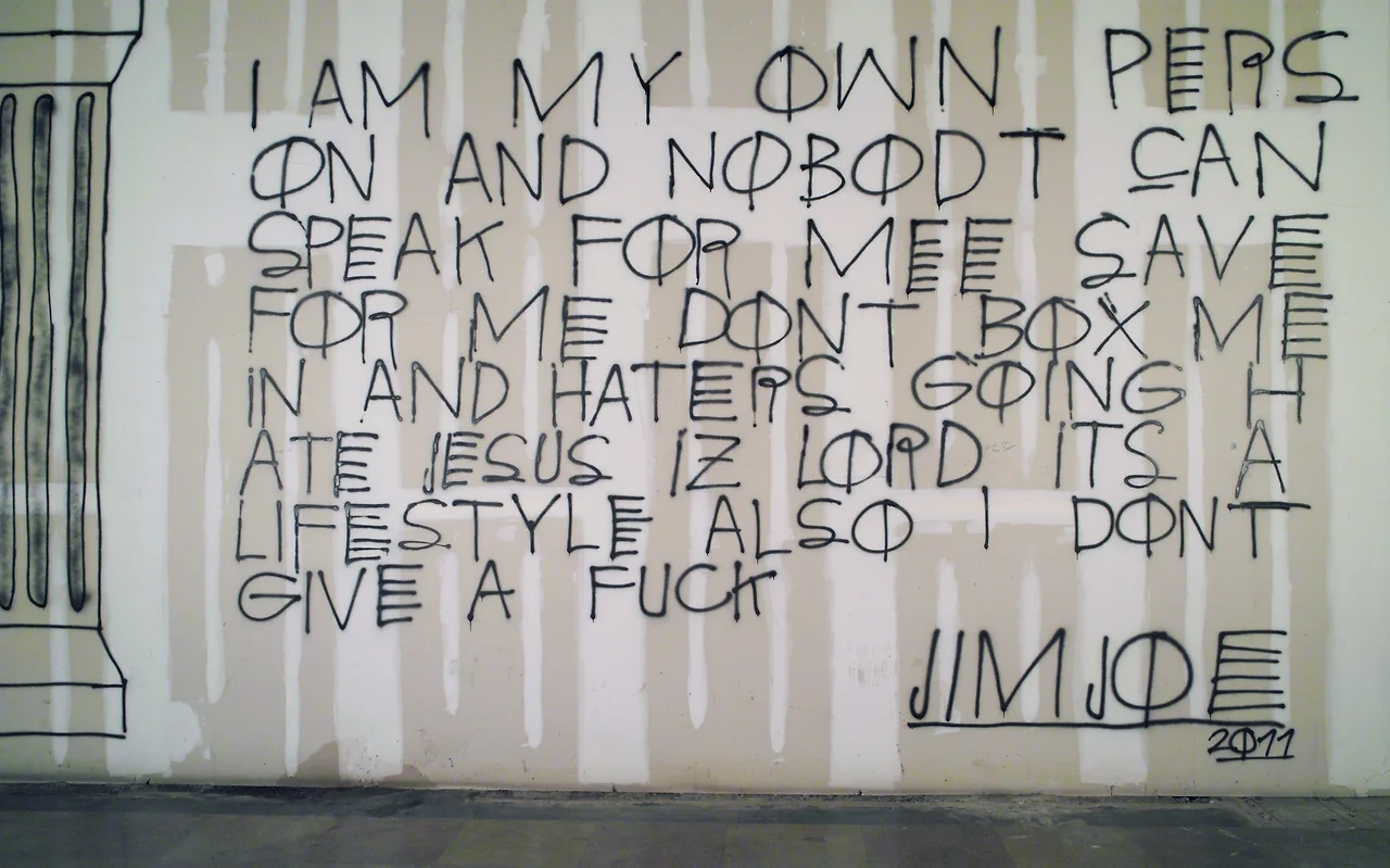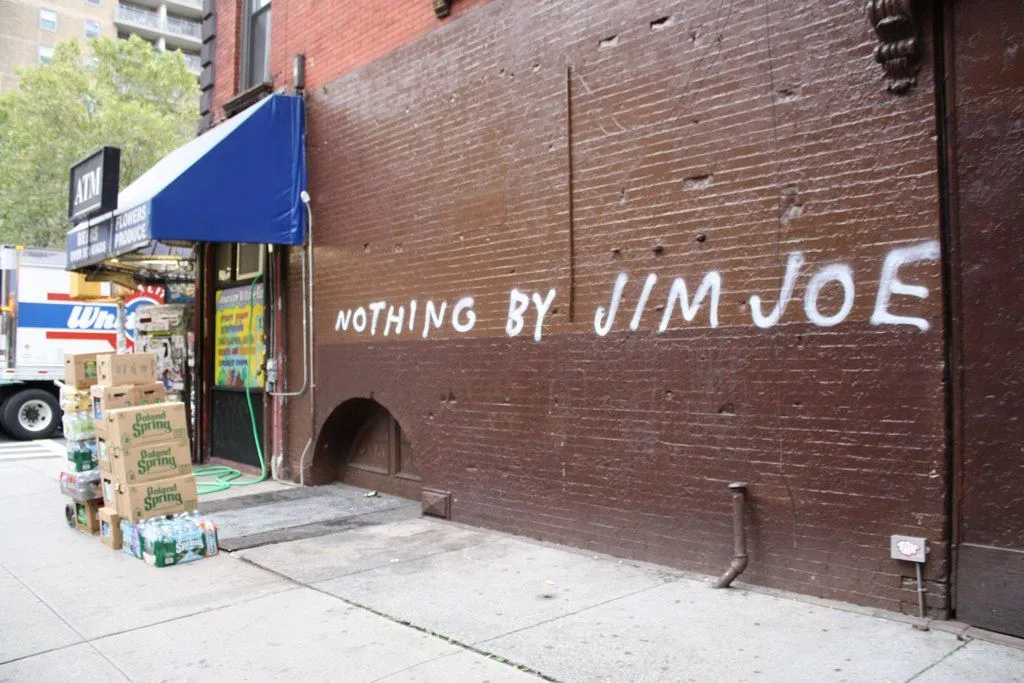그라피티 아티스트 JIM JOE는 2010년 경부터 미국 뉴욕의 길거리를 싸돌아다니며 호기심을 부르는 ‘낙서’ 수준의 여러 글귀들을 곳곳에 써 갈겨 유명세를 얻었습니다.