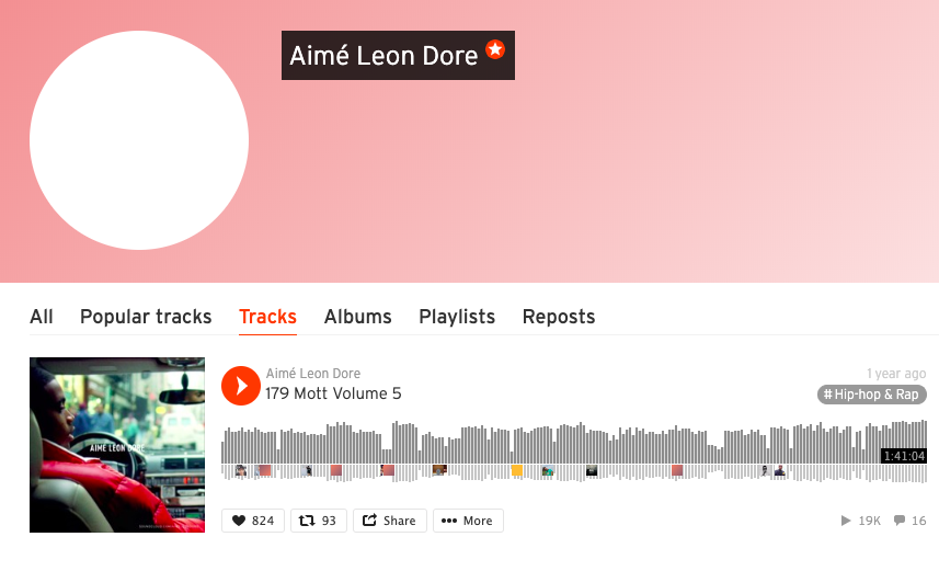 Aime Leon Dore의 공식 사운드 클라우드 페이지에 접속하면 '179 Mott Volume 1'부터 '179 Mott Volume 5'까지 호기심을 부르는 제목의 트랙 다섯 개가 업로드되어 있습니다. 가장 짧은 러닝 타임은 1시간 41분이고 가장 긴 러닝 타임은 2시간 44분에 이르기도 하는데, 미국의 올드스쿨 힙합 음악을 잘 큐레이팅하여 이어 붙여 놓았습니다.