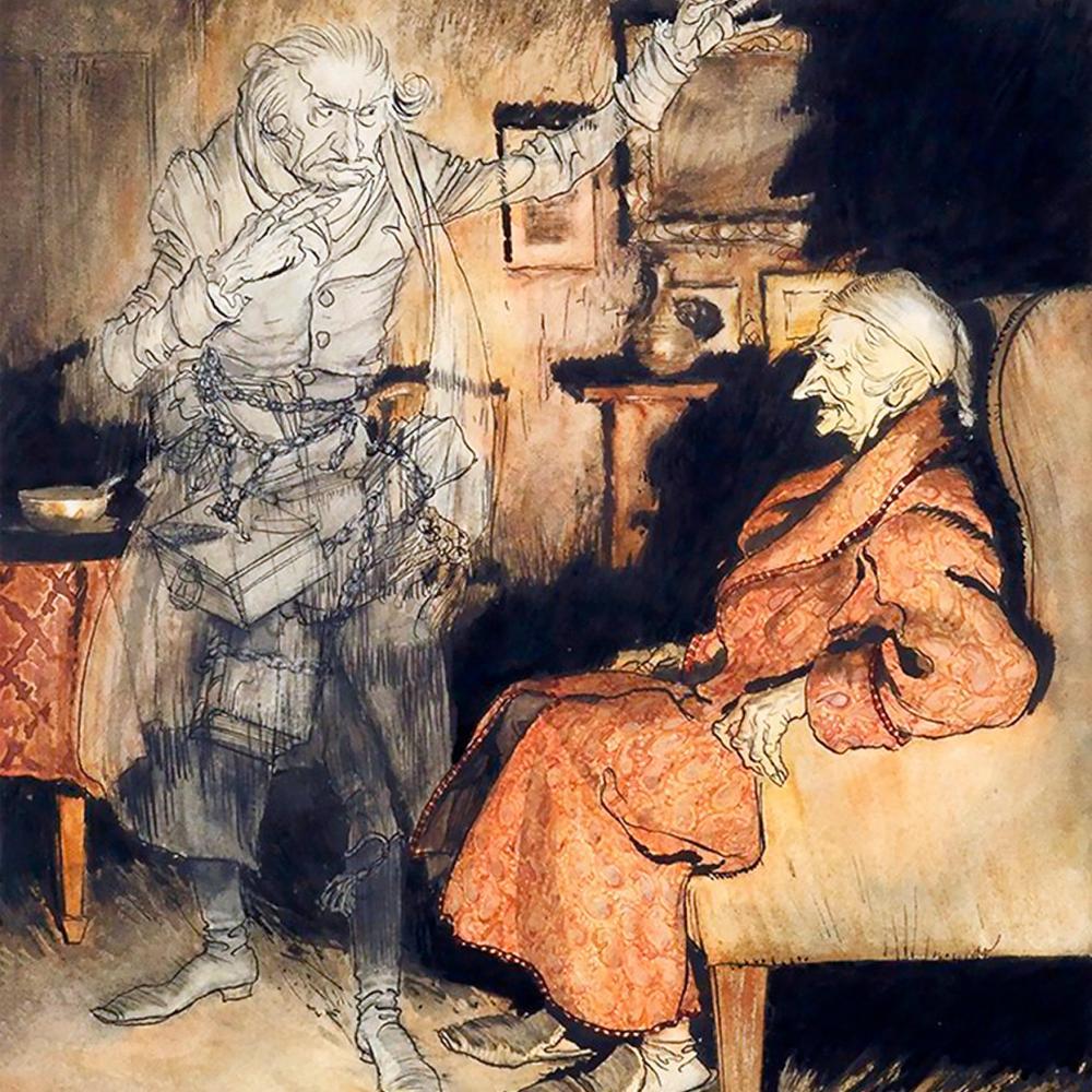 처음 맞닥뜨린 동업자 ‘말리’의 망령(첫 번째 유령)에겐 센 척하며 농담도 던져보는 스크루지, 하지만 그는 이내 공포스러운 분위기에 굴복하고 무릎을 꿇는다. 제발 살려달라면서! 도대체 내게 원하는 게 무엇이냐면서! 사슬에 묶인 말리 유령은 자기처럼 ‘돈 사슬’에 묶여 정신없이 사는 스크루지에게 인생은 짧아도 이웃을 도울 방법은 무궁무진함을 강조한다. 지상에서 할 수 있는 선행을 다 하면서 살라고! 그러면 운명을 바꿀 기회와 희망이 있다고!