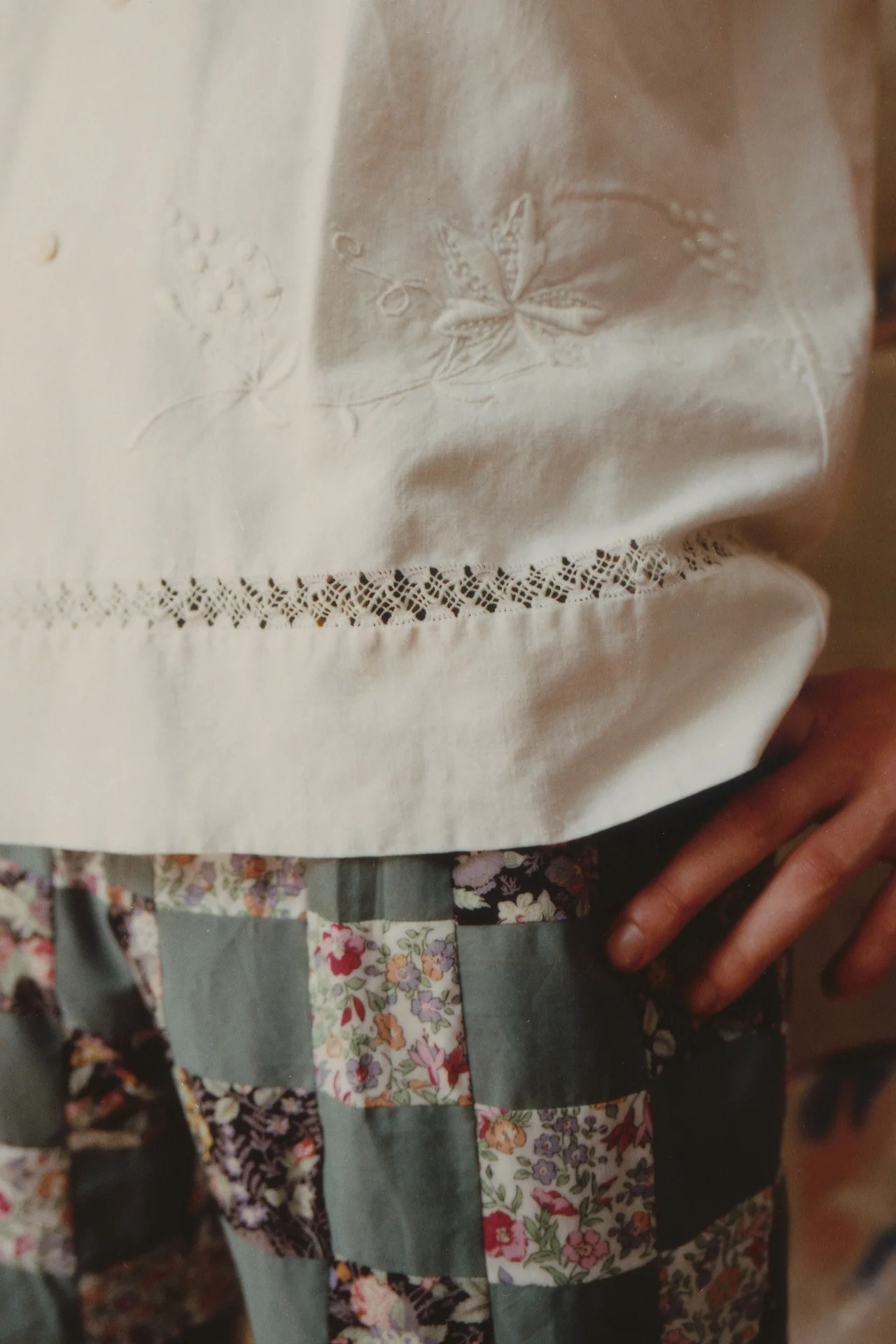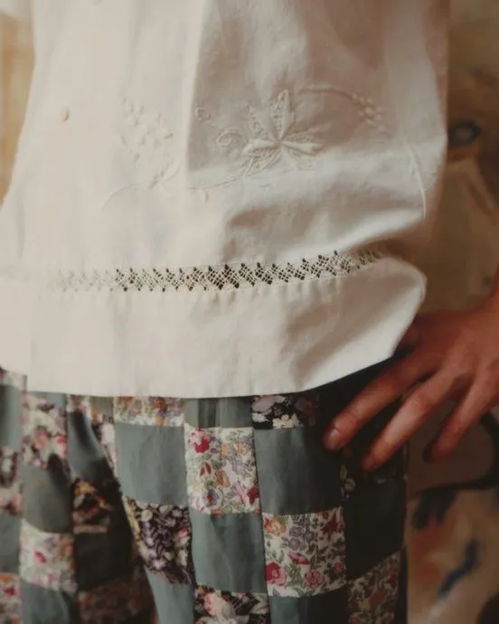 무려 빅토리아 시대의 퀼트, 1920년대의 리넨, 테리 클로스, 미국 퀘이커 사의 레이스 테이블 보, 손수건, 침대 덮개, 담요, 배지, 삼각기, 기모노 자수 등 에밀리 보디의 빈티지/데드 스톡 패브릭 아카이브는 깊이 있고 다채롭다. 그리고 그것들은 필연적으로 개별적인 역사와 고유의 스토리를 지니는데, 그녀는 이러한 소재에 수공예 의상 제작 기법을 접목해 브랜드 창립 초기 세상에 단 하나뿐인 아이템들을 만들어냈다. 다만 그것들이 현대적이고 지속 가능한 공정을 거칠 수 있도록 했다.