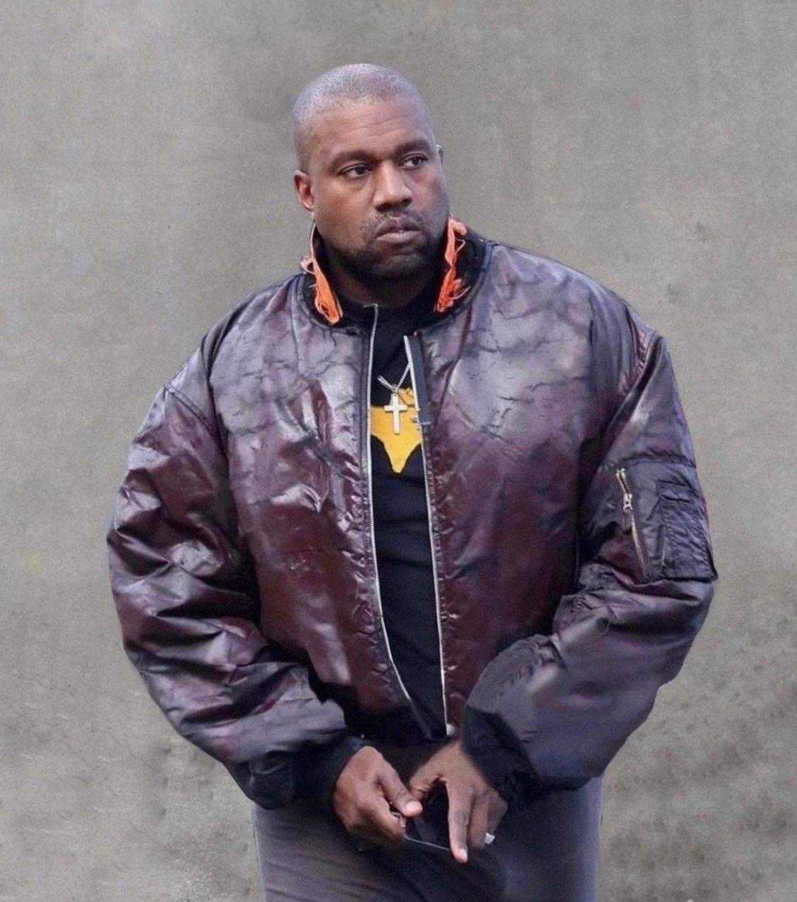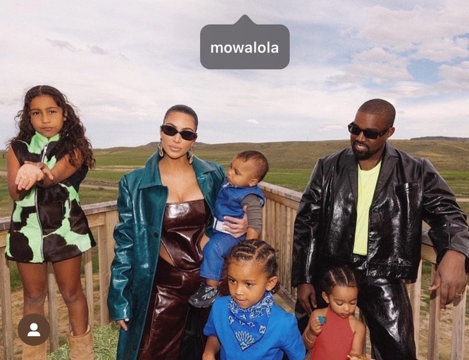 커스텀 가죽 재킷을 걸친 카니예 웨스트와 킴 카다시안 그리고 그들의 아이들 머리 위 하늘 가운데에는 태그도 하나 걸렸다.