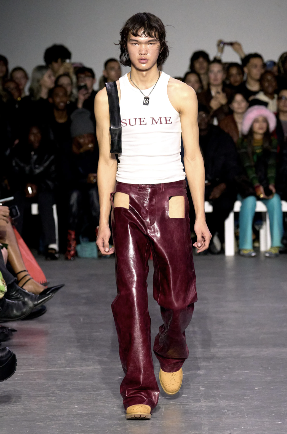 그녀는 2023 가을 컬렉션을 통해 소니 워크맨, 맥도널드, 뉴욕 현대미술관, 양키스 등 아이코닉 브랜드의 로고를 대놓고 비틀더니 연속된 전시 중간에 <SUE ME>라는 텍스트가 박힌 탱크톱과 함께 끝내 도발했다.