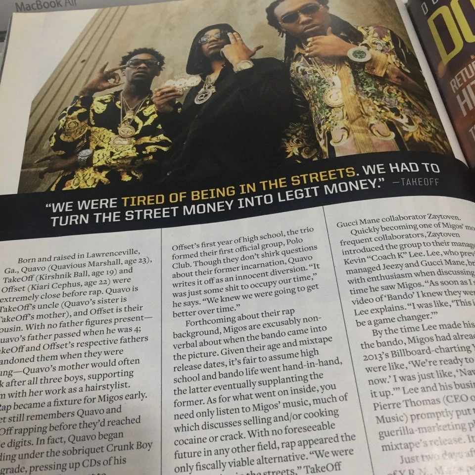 3월의 끝자락인 오늘 오후, 왕성하도록 생기 넘치는 미고스와 전화 통화를 했다. 그들은 조지아에 위치한 그룹의 새 집(그들은 미고스 맨션이라고 부른다.)에서 전화를 받았다. 그들의 최근 행보는 로컬과 인터넷 센세이션으로부터 ‘Versace’라는 싱글과 ‘Young Rich Niggas’라는 믹스 테이프로 빌보드에 오르는 급성장의 결과 그 자체다.