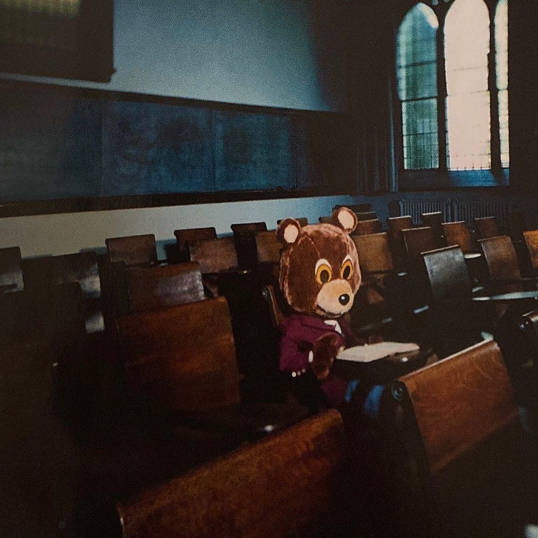 먼저 2004년에 나온 정규 데뷔작 <The College Dropout>의 앨범 커버를 보면 실제 대학 중퇴자였던 자기의 삶을 대변하는 마스코트로서 ‘중퇴한 곰돌이(Dropout Bear)’가 처음으로 등장한다.